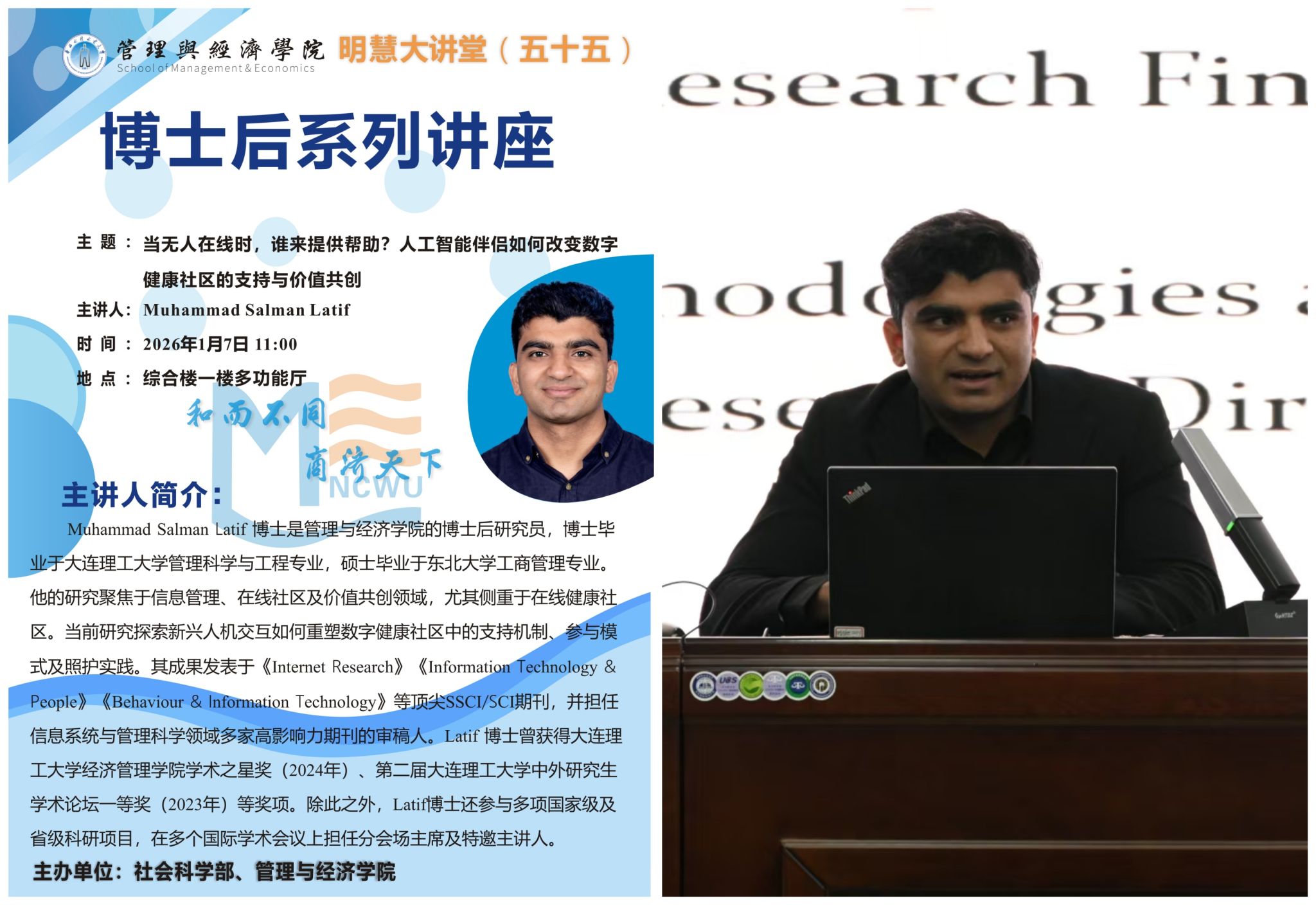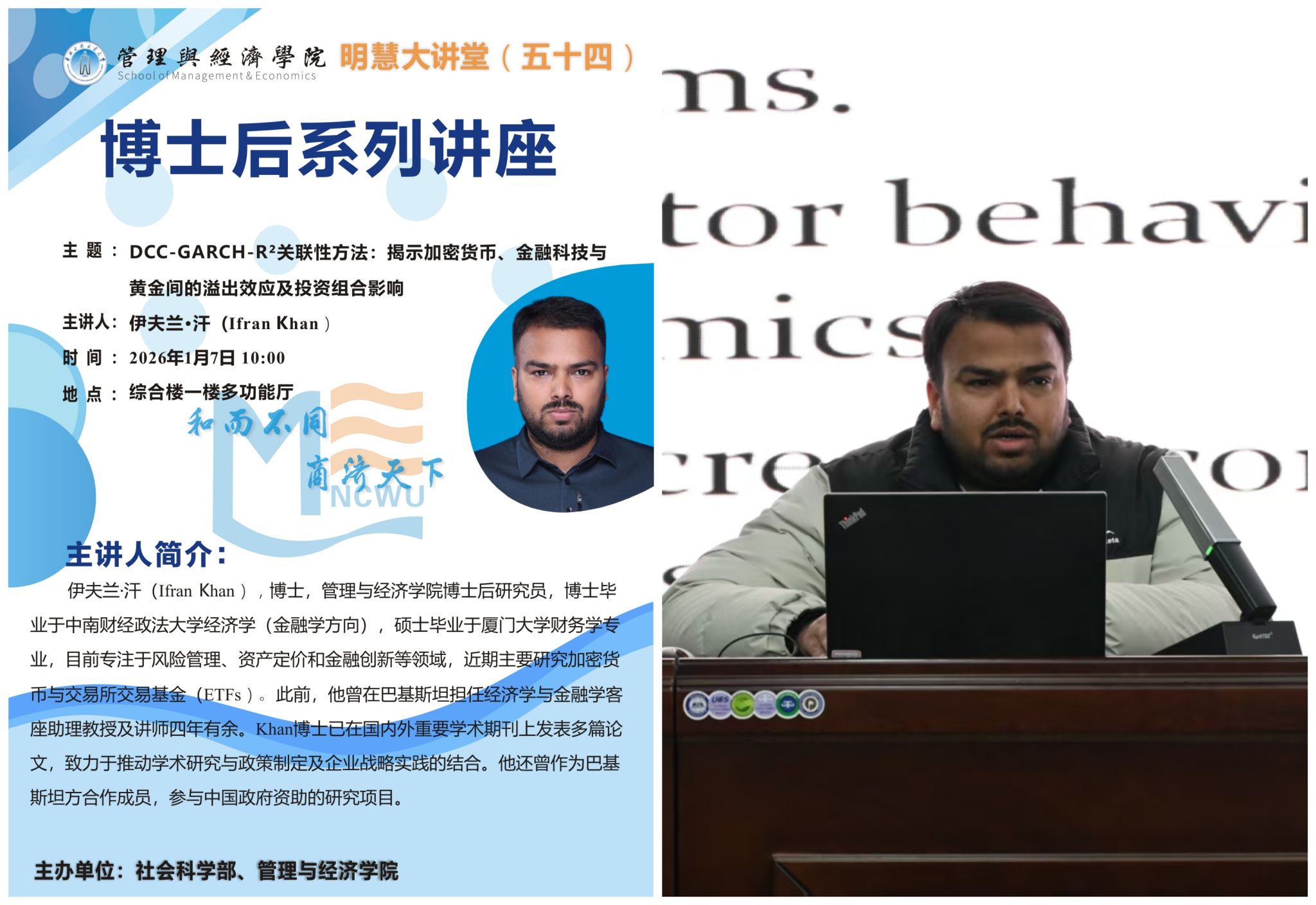 2026年1月7日上午10:00,管理与经济学院“明慧大讲堂”第五十四、五十五期暨博士后系列讲座第一、二期在综合楼一楼多功能厅举办。本次讲座由管理与经济学院副院长魏怀斌教授主持,我院外籍博士后Ifran Khan博士与Muhammad Salman Latif博士担任主讲人。院长李纲、院党委副书记于海丽、副院长卢亚丽、学院博士后管理办公室与研究生办公室工作人员、全体研究生及在站博士后参加了本次讲座。