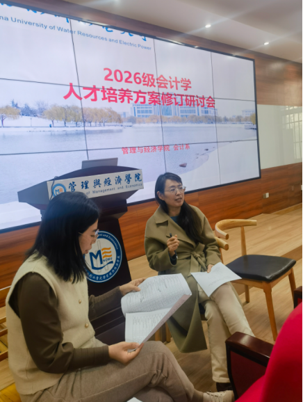 为贯彻落实党的二十届三中全会和全国教育大会精神,准确把握高等教育发展的新思想、新要求、新任务,根据学校的发展目标,坚定实施“四卓越两赋能一提升”行动,落实《华北水利水电大学2026版本科专业人才培养方案修订指导意见》的要求,会计系开展会计专业人才培养方案的修订工作。2025年11月20日下午,会计学系在6216召开培养方案修订研讨会,邀请郑州航空工业管理学院张桂玲教授针对我校会计学专业人才培养方案提出修改意见,会计学系全体教师参加此次研讨会。