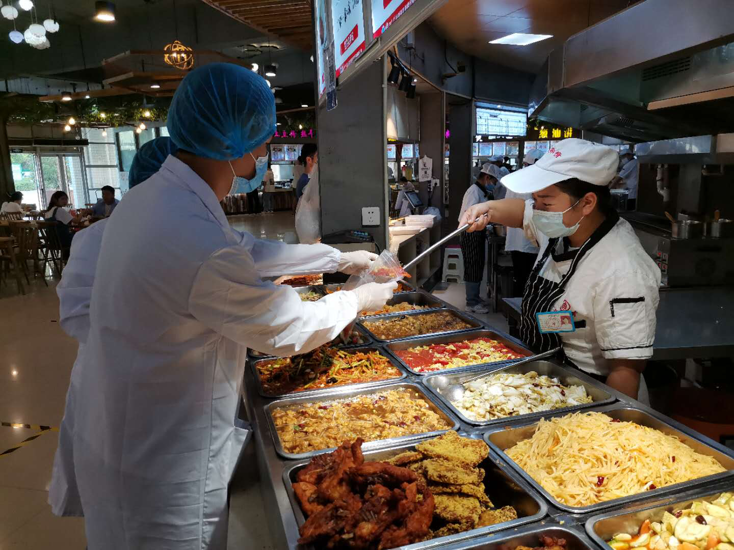 中心制定《秋季开学餐饮服务实施方案》,明确责任,实行网格化管理,压实责任,形成“科室-餐厅-窗口”管理模式,确保餐饮食品安全以及疫情防控安全。8月12日起,餐饮服务人员开始打卡上报每日健康信息和行动轨迹。8月18日召开开学前工作准备会议,部署开学前餐饮各项准备工作。餐饮服务员工返校前需持有抗体检测结果、健康证、绿色健康码,疫情重点区域人员暂缓返校。8月20日起,连续三天对餐厅环境、餐具、炊具进行消杀。严格落实《餐饮服务食品安全操作规范》要求,确保食品安全。各餐厅储备充足的疫情防控物资。按照疫情防控要求,餐饮人员均戴口罩。每日三次对餐厅内及周边进行消杀。设置一米线,倡导勤俭节约,杜绝餐饮浪费,鼓励学生文明用餐,光盘行动。后厨实行封闭管理,餐厅延长营业时间,学生错时错峰用餐。清理过期、变质调料,禁止使用临近保质期的调味品。严格执行原材料索证索票、食品留样要求。邀请第三方食品检验公司进校随机抽查和抽样检查,确保饮食卫生安全。