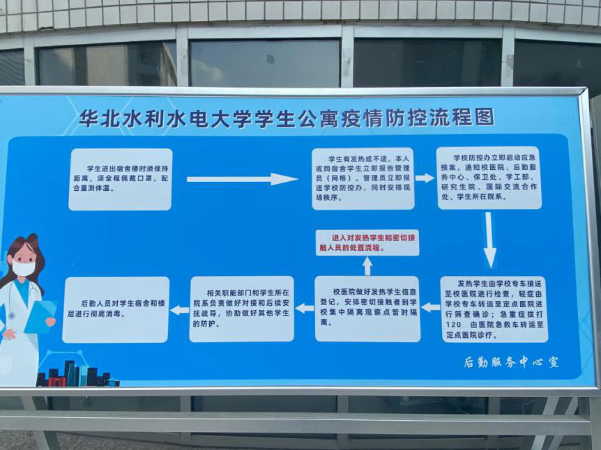 为保证学生住宿安全舒适,中心按照学校疫情防控工作安排,制定了学生公寓疫情防控工作方案。严格物业服务人员健康管理,严格公寓有序出入和体温测量,严格日常通风、消毒和保洁制度。加强宣传引导,注重自我防护。通过宿舍宣传展板、条幅、公寓服务微信群等方式开展疫情防控宣传。8月28日开展疫情防控演练活动,重点模拟演练了学生宿舍内学生自测体温异常者应急处置流程,演练工作人员按场景、流程、角色实战演练。按照疫情防控工作要求,宿舍内学生每天早晚各自测体温1次,及时上报辅导员,信息记入健康台账。若宿舍发现体温异常者,寝室长按网格流程层层上报,发热同学由校医院防疫人员引导至临时留观点或隔离间,按流程规范对其进行下一步处置,公寓物业服务人员对生活区域进行消杀。
