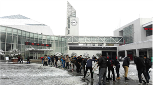 在总务后勤处干部职工进行除雪的同时,100名学生志愿者也加入了除雪活动。大家不畏严寒,不辞辛苦,经过几个小时的共同努力,终于将主干道、广场上、教学区、学生生活区的积雪清理干净,为广大师生的安全出行提供了的便利。