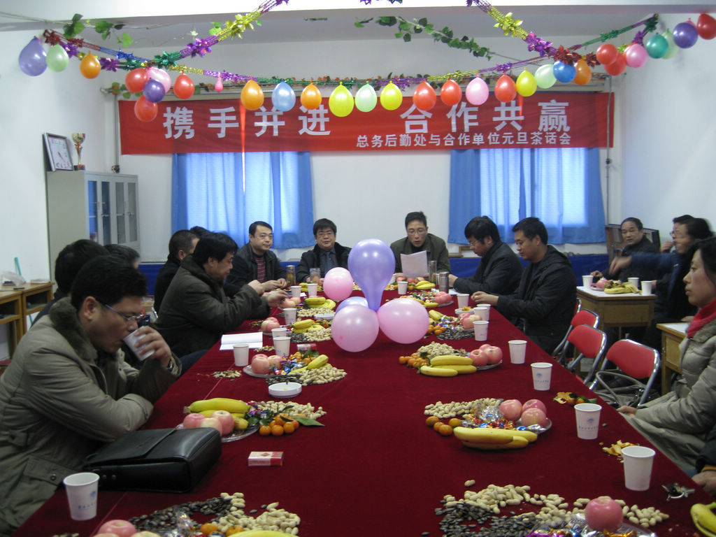 2010年12月24日下午4时,在总务后勤处三楼教工活动室召开了“总务后勤处与合作单位元旦茶话会”。总务后勤处处长苏喜军、党总支书记董贵恒、副处长赵勇、李荣喜、韦乐余及相关科室的科长与合作单位的主要负责同志40余人欢聚一堂,笑语欢歌,共迎2011年的新春。这是总务后勤处第一次举办与合作单位的茶话会。