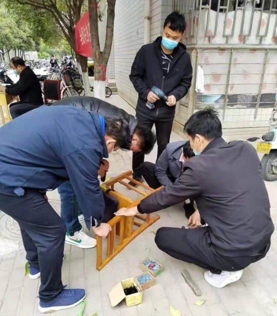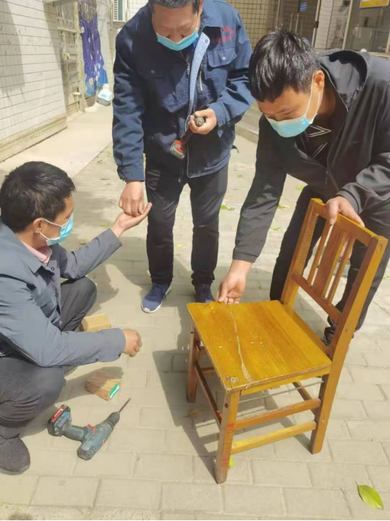 在“我为师生办实事”服务点,接受报修,现场维修,师生送来需要维修的桌椅,学生报修柜子、床铺等,维修师傅一边做好信息登记,一边认真修理。当天下午,共为学生修理凳子16个,加固上床梯子、维修床板13个,修理柜子7个。