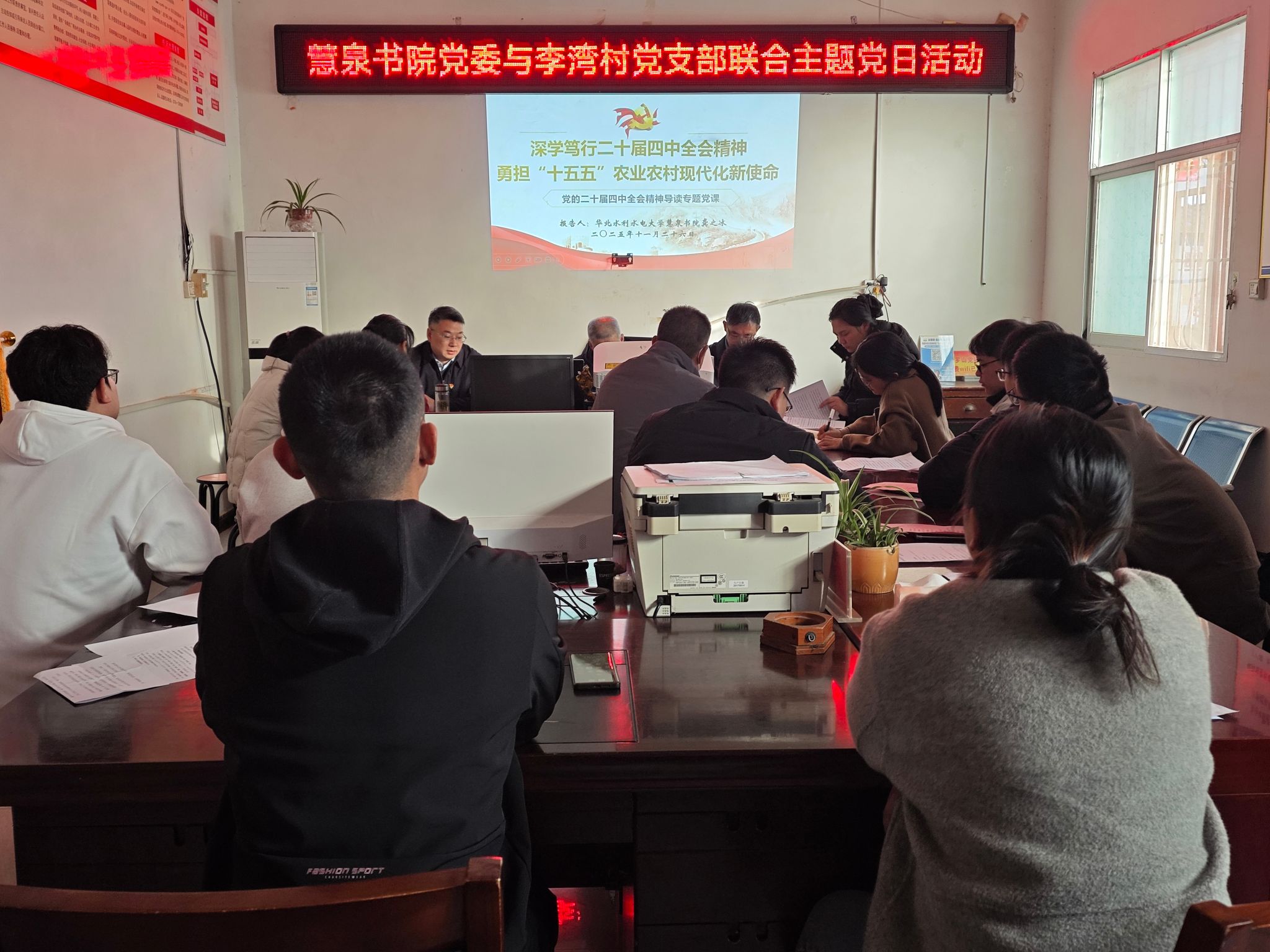 11月26日,慧泉书院党委赴罗山县尤店乡李湾村联合开展“学习贯彻党的二十届四中全会精神 以‘党建+’赋能和美乡村建设”主题党日活动,推动全会精神在基层和师生中落地生根,探索书院与村党支部理论联学、活动联办、工作联动、支部联建、品牌联创“五联”党建工作模式,助力党建引领基层高效能治理、思想政治教育和乡村全面振兴。书院党委书记龚之冰、院长李幸福、尤店乡副乡长方金明,书院理论学习中心组成员、师生党员代表、李湾村两委党员代表、校驻李湾村工作队共同参加主题党日活动。校驻村第一书记贾振亮主持活动。