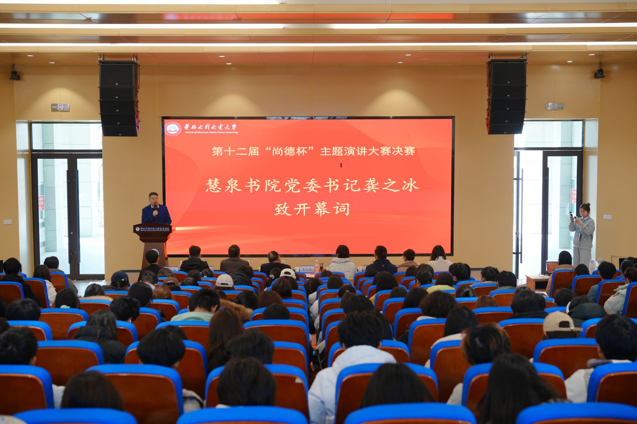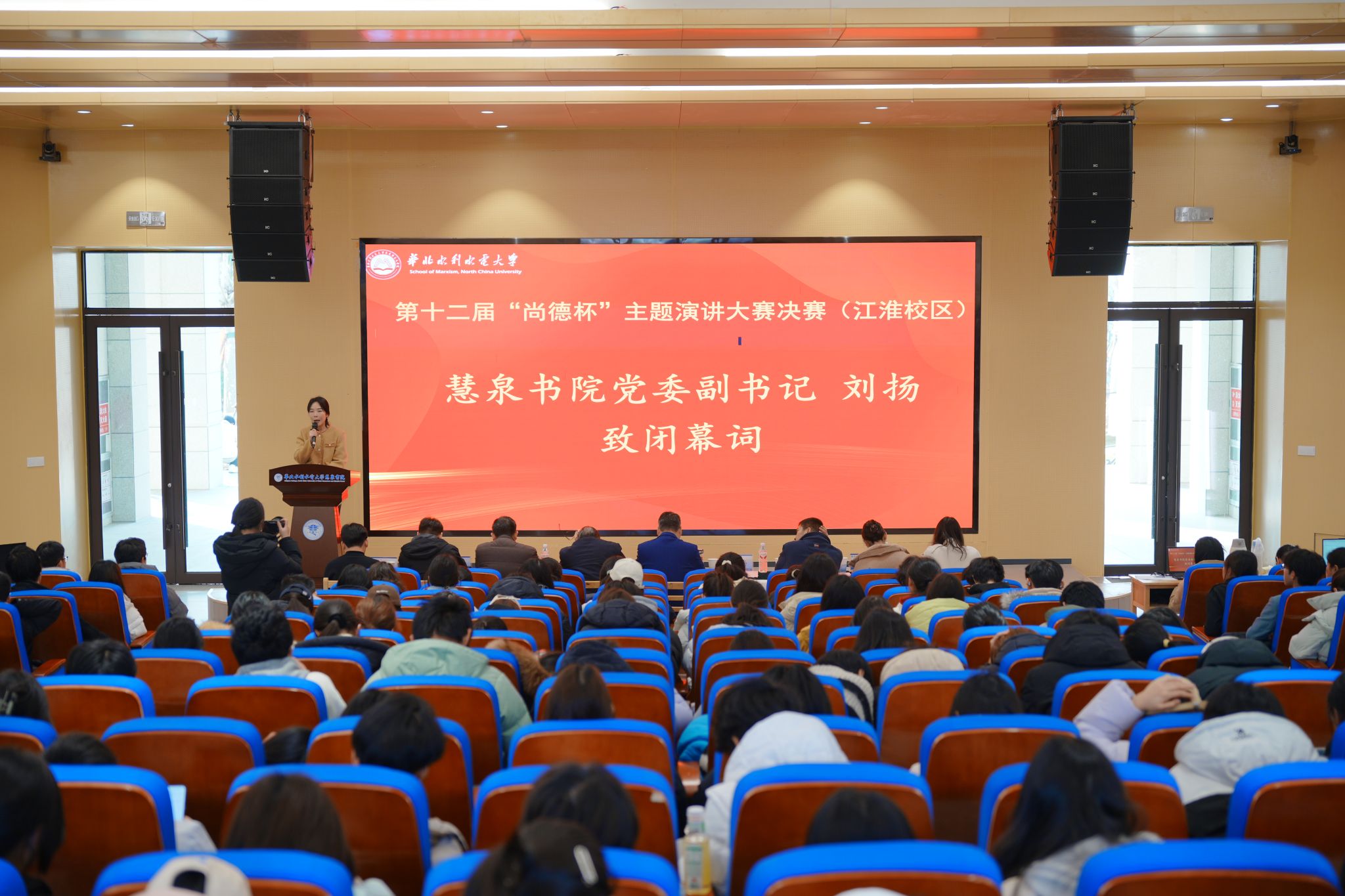 12月25日下午,第十二届“尚德杯”主题演讲大赛江淮校区决赛在第四报告厅举行。此次活动由马克思主义学院、慧泉书院共同主办,思想道德与法治教研室承办、校大学生MMDX学习研究会协办。慧泉书院党委书记龚之冰、智川书院院长饶明奇、慧泉书院党委副书记刘扬、智川书院副院长尚发成、马克思主义学院思政课教学研究中心副主任凌海霞、“思想道德与法治”课程任课教师、学生代表近百人参加了活动。