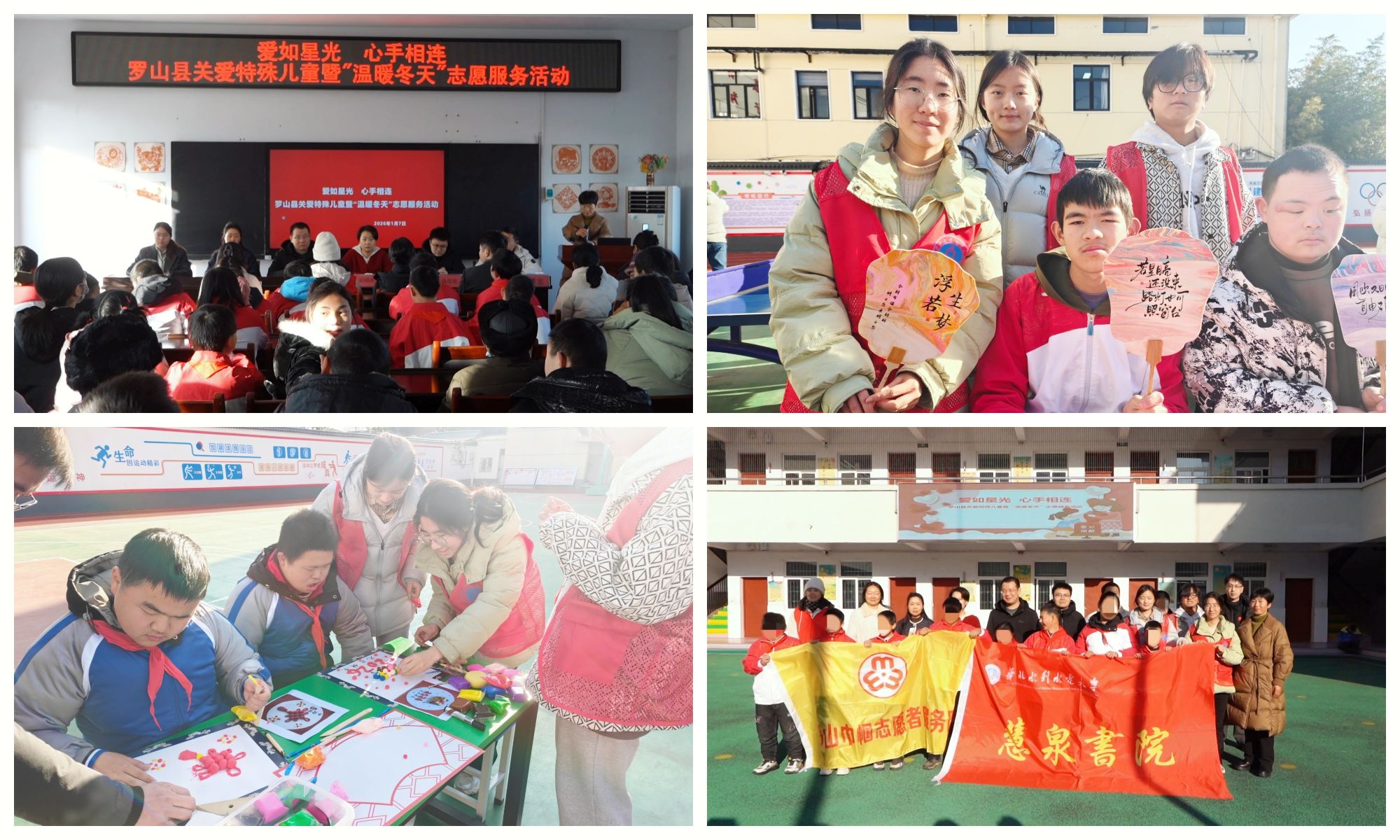 1月7日上午,慧泉书院联合共青团罗山县委、罗山县青年联合会、罗山县妇女联合会、罗山县义工协会共同开展的“爱如星光 心手相连”——关爱特殊教育儿童暨“温暖冬天”志愿服务活动在罗山县特殊教育学校温暖举行。
