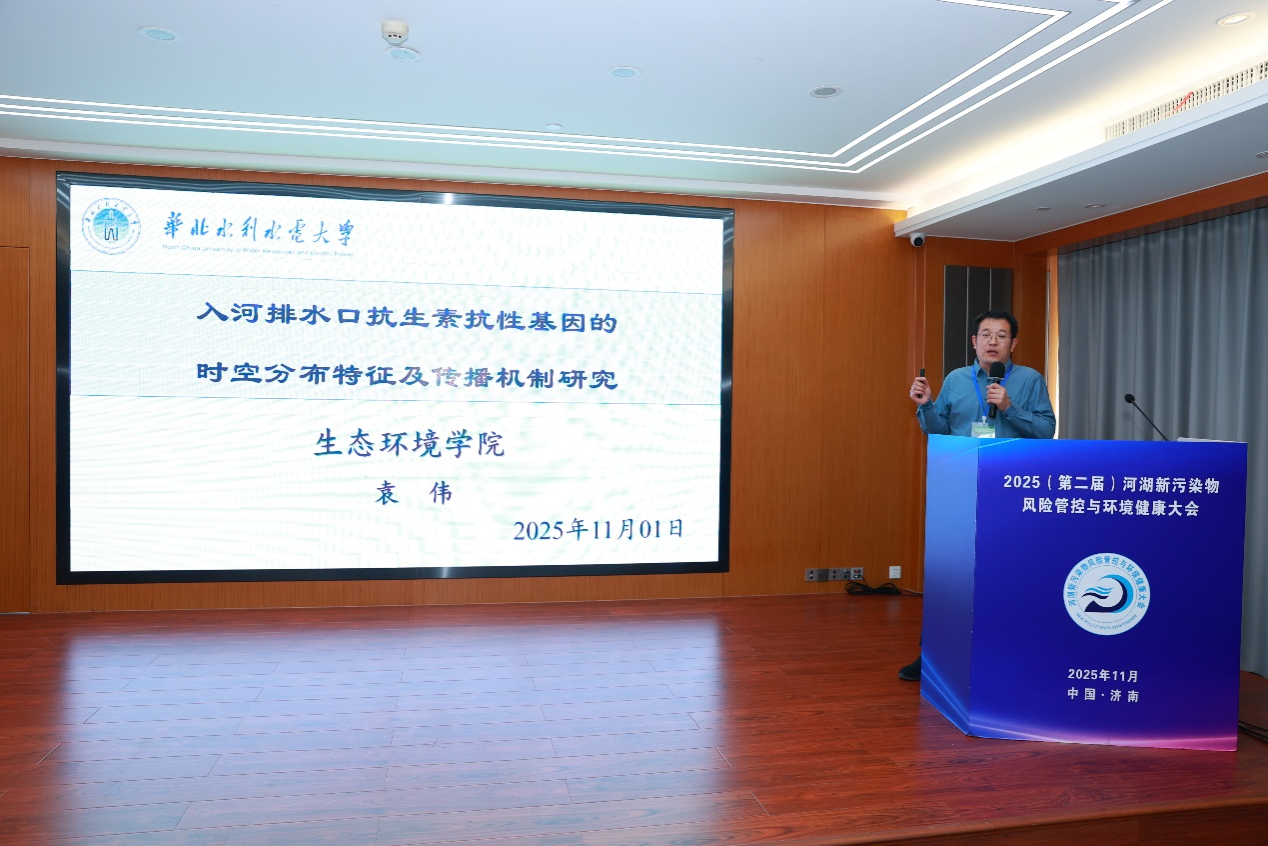 在开幕式环节,袁伟老师代表主办单位为本次学术交流会致辞,他在发言中指出,随着我国经济社会快速发展,新污染物在河湖系统中的赋存、迁移及生态风险日益成为环境领域关注的焦点。有效管控新污染物风险,不仅是践行国家生态文明建设战略的重要举措,更是保障水环境安全与公众健康的迫切需求。此外,袁伟老师应邀作了题为《入河排水口抗生素抗性基因的时空分布特征及传播机制研究》的相关报告,展示了我院在新污染物的环境迁移及空间分布特征方面的最新研究成果,报告内容详实、观点新颖,引发了与会者的热烈讨论和积极反响。