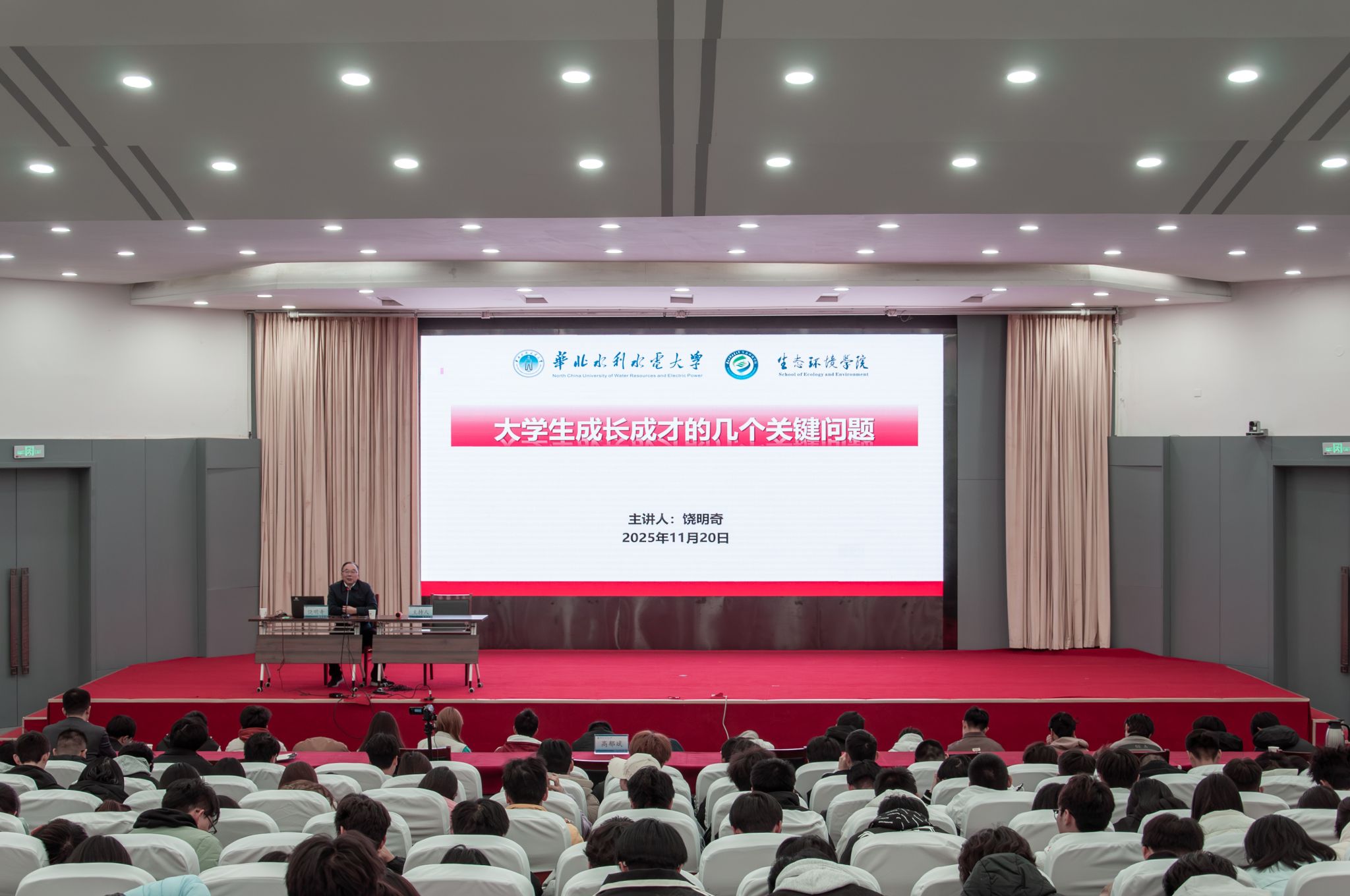 为深入学习贯彻党的二十届四中全会精神,充分发挥“五老”作为历史亲历者、时代见证者与育人实践者的独特优势,引导广大学子努力成长为有理想、敢担当、能吃苦、肯奋斗的新时代好青年,11月20日下午,学校关工委副主任饶明奇教授应邀为生态环境学院师生作德育主题宣讲报告。学院2025级410余名本科新生现场聆听讲座,学院党委副书记高郁斌主持报告会。