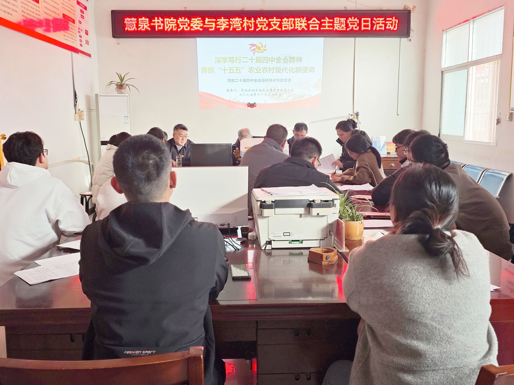 11月26日,慧泉书院党委赴罗山县尤店乡李湾村联合开展“学习贯彻党的二十届四中全会精神 以‘党建+’赋能和美乡村建设”主题党日活动,推动全会精神在基层和师生中落地生根,探索书院与村党支部理论联学、活动联办、工作联动、支部联建、品牌联创“五联”党建工作模式,助力党建引领基层高效能治理、思想政治教育和乡村全面振兴。书院党委书记龚之冰、院长李幸福、尤店乡副乡长方金明,书院理论学习中心组成员、师生党员代表、李湾村两委党员代表、校驻李湾村工作队共同参加主题党日活动。校驻村第一书记贾振亮主持活动。