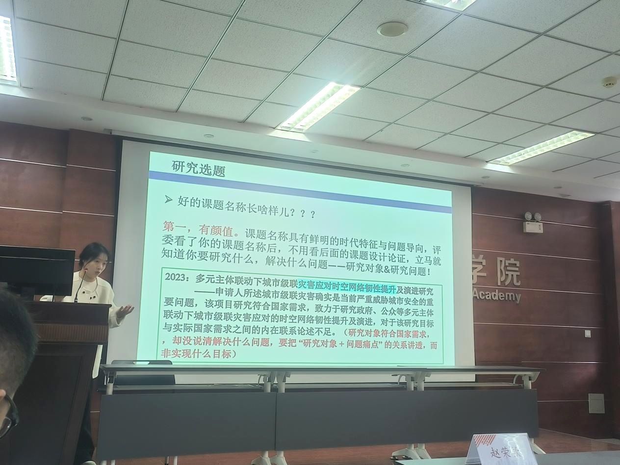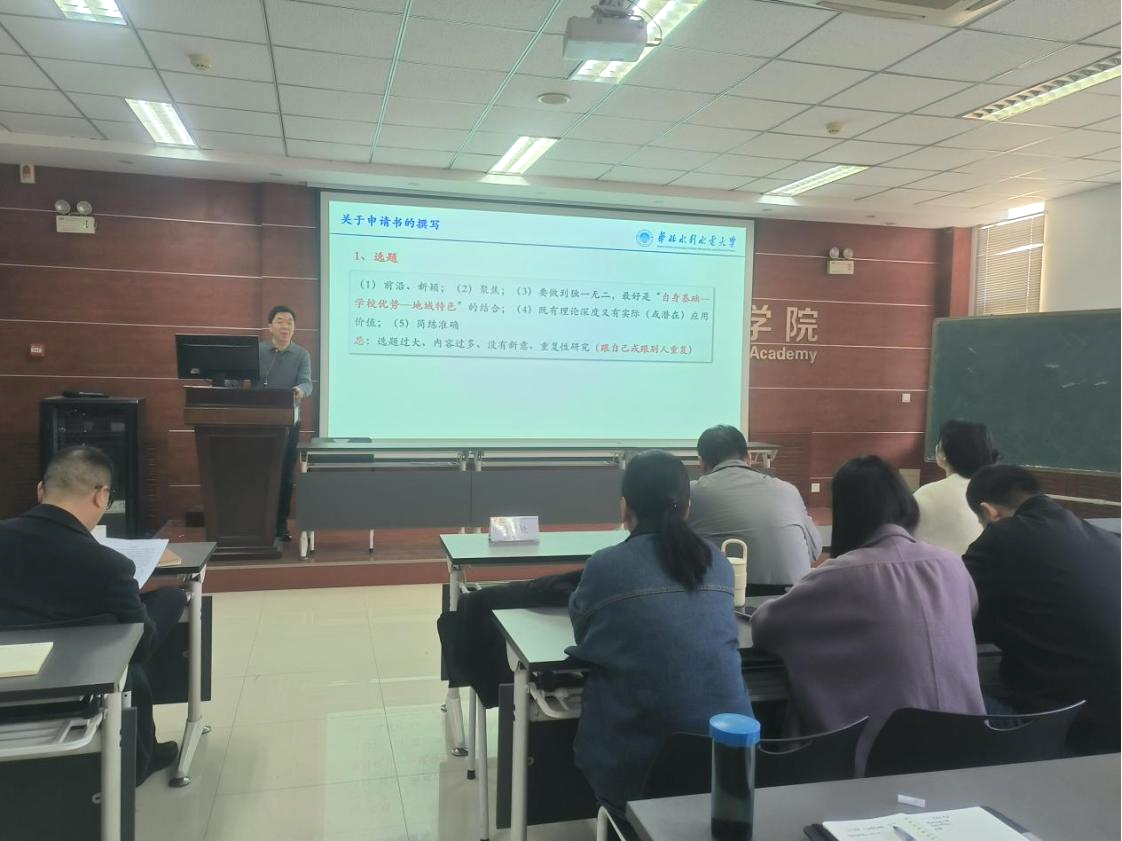 高长征介绍了受邀讲座专家及相关安排,进一步通报了学院科研运行的基本情况,并就下一阶段基金组织与服务工作提出具体要求。两位受邀专家围绕基金申报的关键环节开展辅导。赵荣钦教授结合多年经验,系统阐述了科学问题凝练、研究方案构建与标书表达的逻辑性要求,指出项目要在理论价值与可行性之间找到有力支撑;柴瑞瑞副教授则针对青年科研人员,明确评审关注的创新点呈现、研究积累证明与成长路径设计,提供了富有可操作性的申报策略。