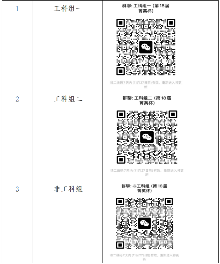 三. 决赛选手抽签。请各组别选手扫码进群,于11月21日(周五14:30-15:00)进行微信群小程序抽签,现场不可改变顺序。