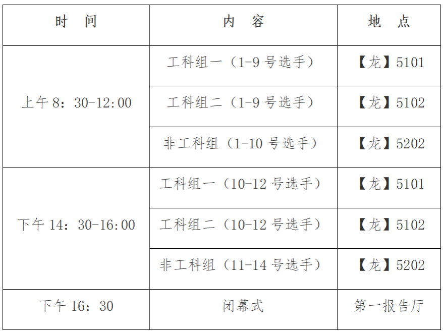 一. 决赛时间、地点、分组。选手分组详情见附件1。现场比赛顺序以微信抽签后号码为准。