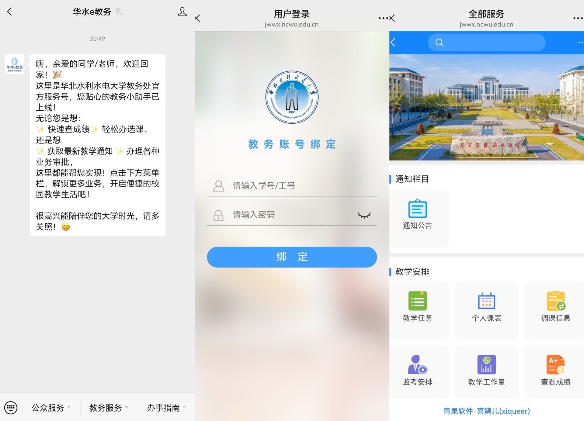 扫描下方二维码直接关注或微信搜索栏输入“华水e教务”,点击关注。依次点击教务服务→教务系统账号和密码登录(非统一身份认证账号),绑定后即可。