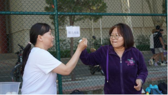 活动中,三尺讲台上的“大先生”们摇身一变,成为运动达人:五彩圆环在空中划出抛物线,套中的瞬间引来一阵“哇”声——有人一箭双雕,有人“四连空”后绝地反击,现场秒变大型“解压现场”。毽子在足尖翻飞,跳绳“双摇”快成残影,篮球投出漂亮抛物线,精准进篮。喝彩声此起彼伏,涌动着青春的节拍。