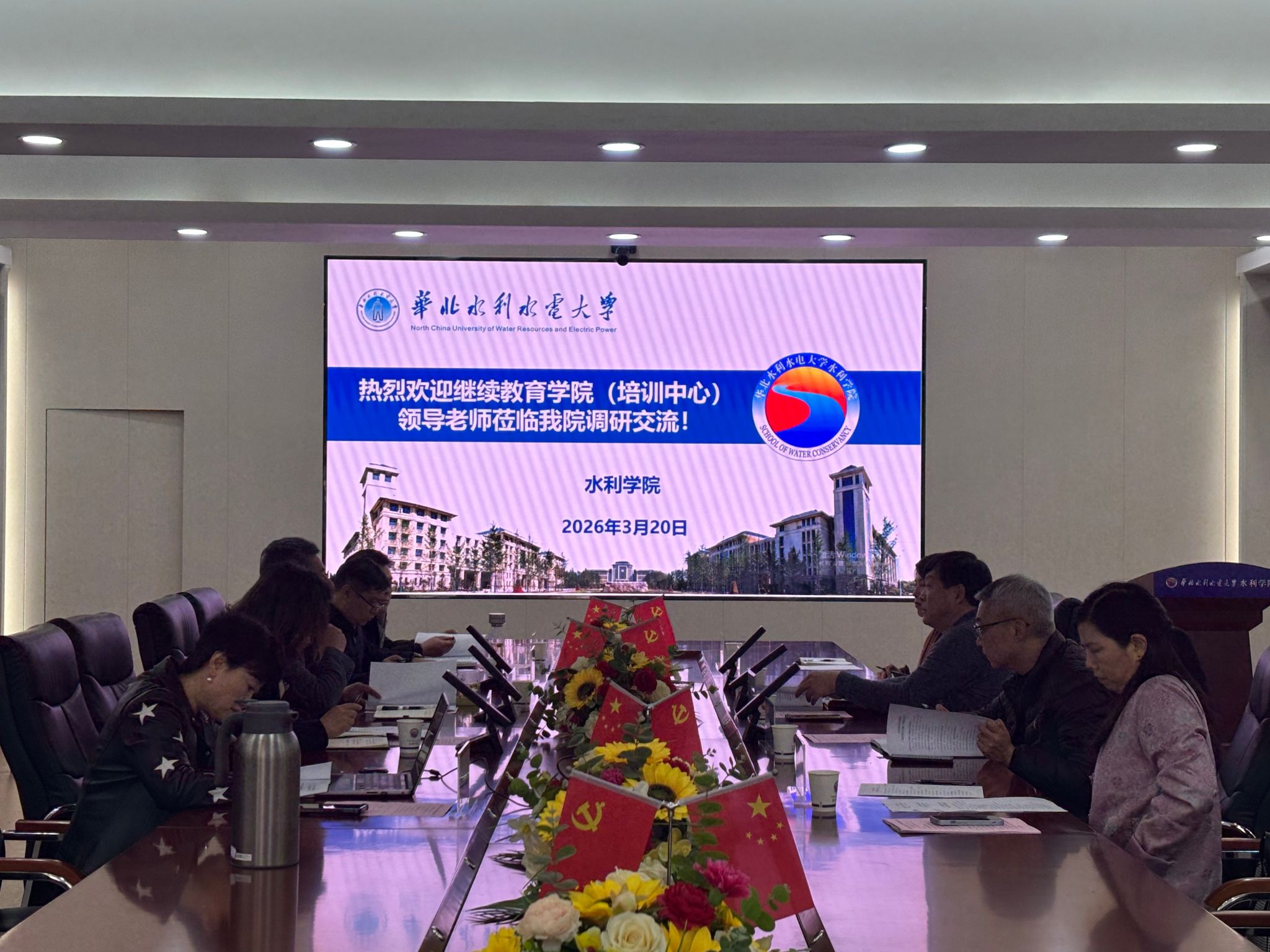 3月20日上午,继续教育学院(培训中心)院长苗彬、副院长朱凯、副院长刘亚菲率领中心工作人员一行,赴水利学院进行交流调研。水利学院党委书记郭玉宾、院长黄生志、执行院长张昕、副院长赵继伟出席了交流座谈会。