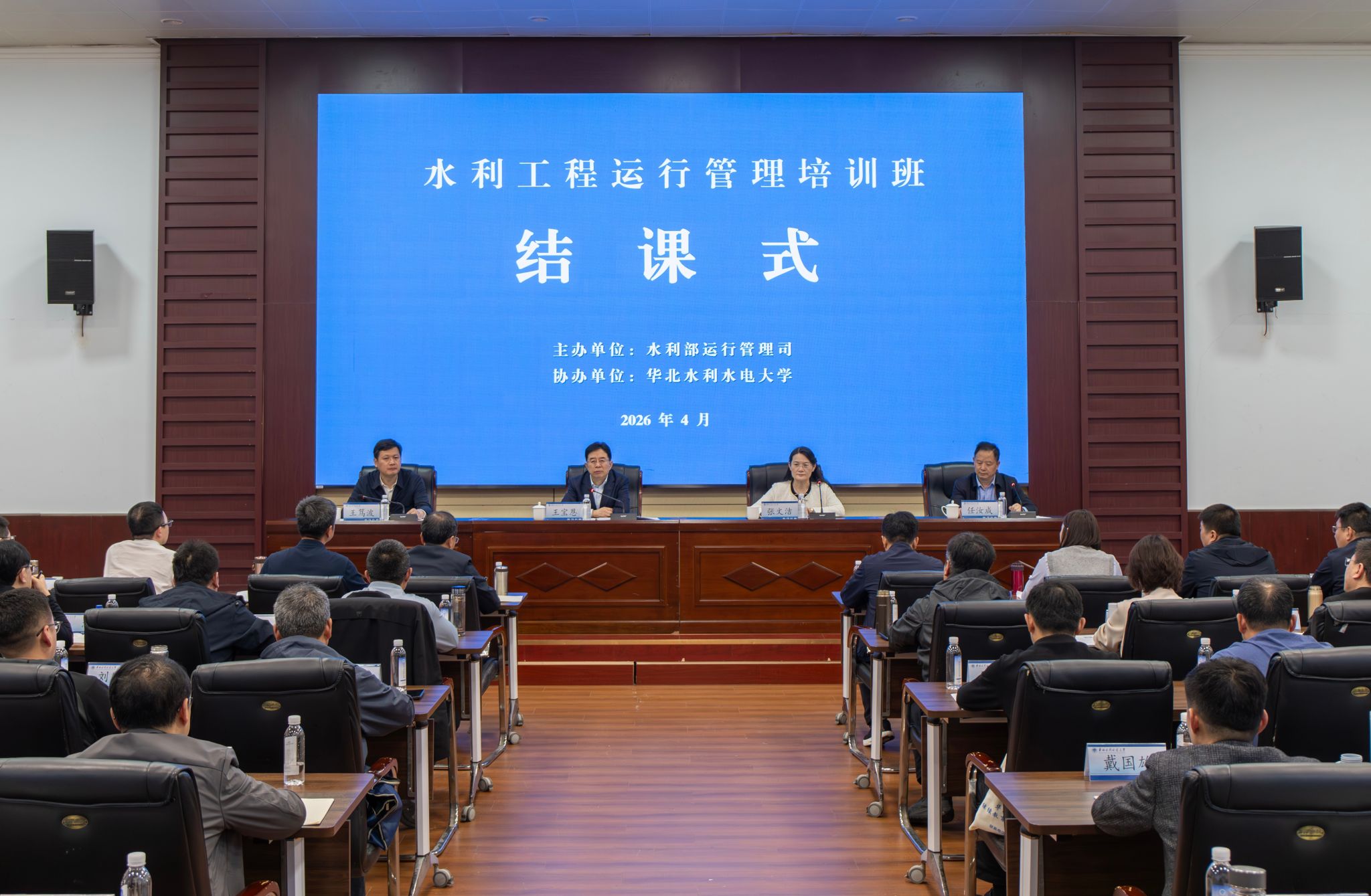 4月10日,由水利部运行管理司主办、华北水利水电大学协办的水利工程运行管理培训班在我校第七会议室圆满落幕。水利部副部长王宝恩、华北水利水电大学党委书记王笃波、河南省水利厅副厅长任汝成出席结业仪式,结课仪式由水利部运行管理司司长张文洁主持,全国水利系统40名运管骨干学员参加了结业仪式。