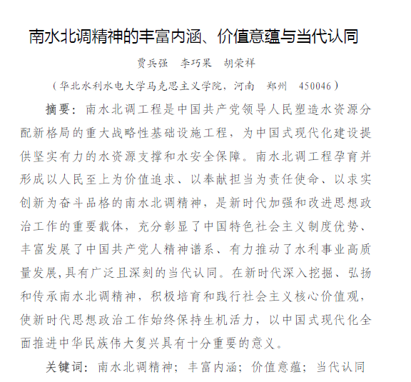 近日,中国政研会印发《关于公布全国政研会系统2024年度研究成果入选名单的通知》,由中国水利政研会推荐、我院贾兵强教授带领研究生李巧果、胡荣祥撰写的研究报告《南水北调精神的丰富内涵、价值意蕴与当代认同》荣获中国政研会2024年度三类优秀研究成果。该成果是中国水利政研会推荐研究报告中唯一获奖成果,这也是我校思想政治研究成果首次在中国政研会优秀研究成果评比中获奖。中国政研会全称为中国思想政治工作研究会,是...