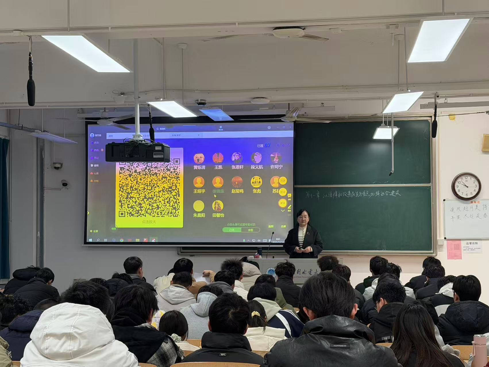 12月16日,副校长李彦彬到马克思主义学院谢文娟老师的《习近平新时代中国特色社会主义思想概论》课堂上听课。