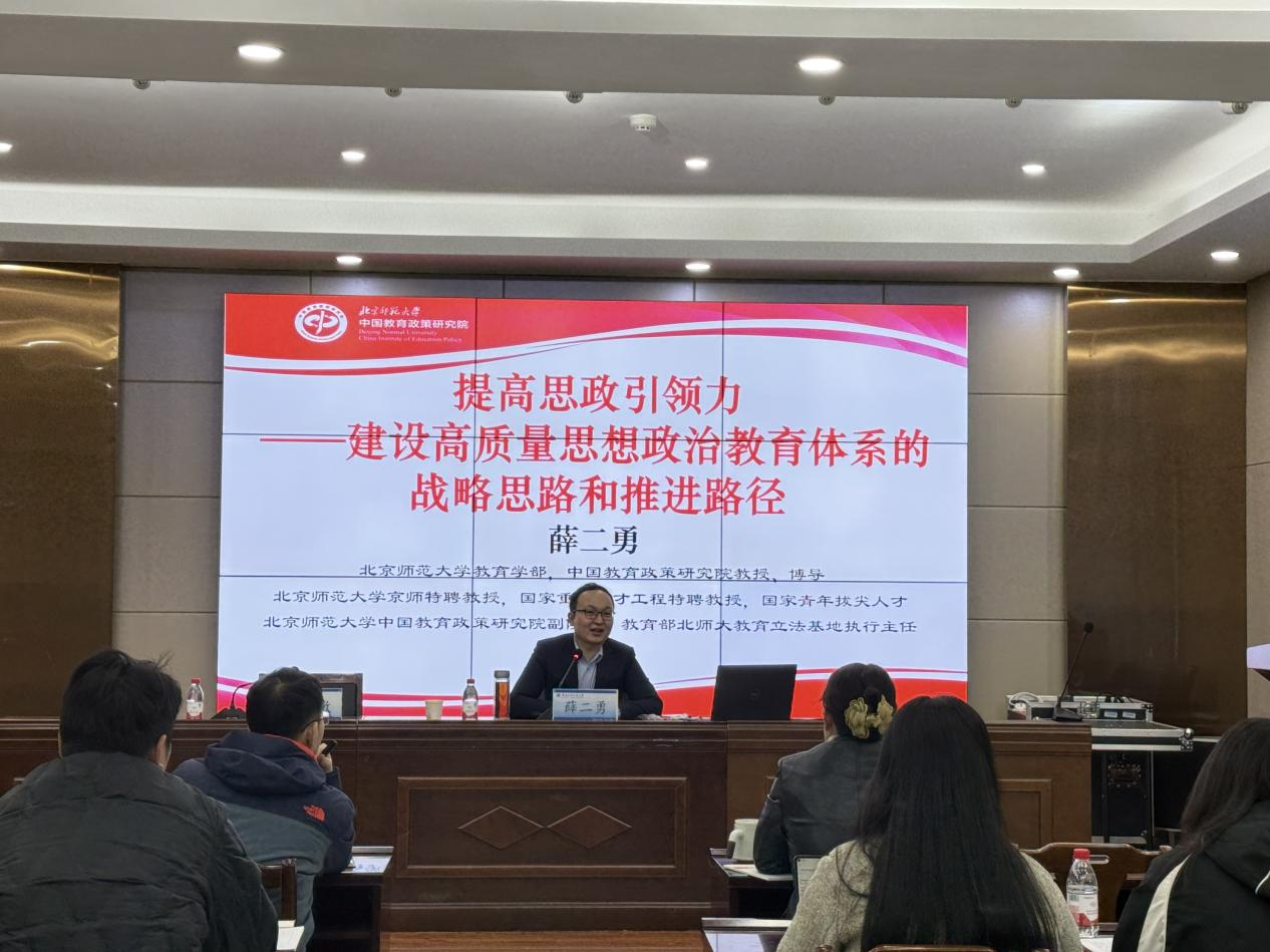 为深化思想政治教育研究,助力学院高质量发展,10月25日上午,我院特邀北京师范大学京师特聘教授,教育学部、中国教育政策研究院教授、博士生导师,北京师范大学特聘教授,国家重大人才工程特聘教授(教育部长江学者特聘教授)、国家青年拔尖人才、北京师范大学中国教育政策研究院副院长、教育部北京师范大学立法基地执行主任薛二勇做客我院“求实论坛”第39期。讲座由学院副院长彭慧敏主持,马院教师代表及全体研究生参加。薛...