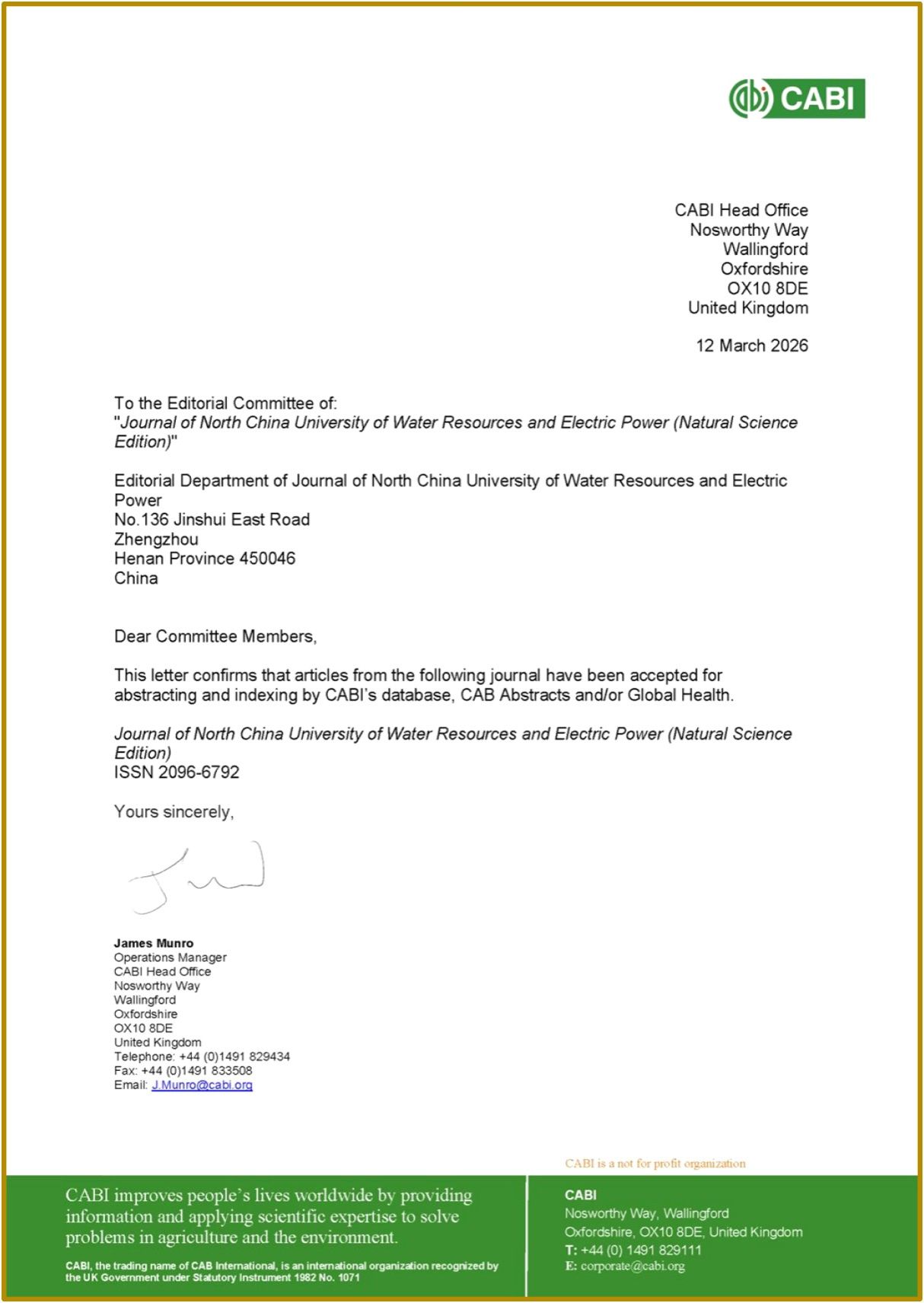 近日,《华北水利水电大学学报(自然科学版)》顺利通过英国国际农业与生物科学中心(Center for Agriculture and Bioscience International,CABI)的评审,正式被CABI数据库收录。此前,本刊已成功入选美国EBSCO、GeoRef,英国EuroPub和日本JST等国际知名数据库。此次入选CABI数据库,标志着本刊的学术质量、影响力、规范化、国际化等方面均获得了国际权威机构认可,国际显示度及影响力得到进一步提升。