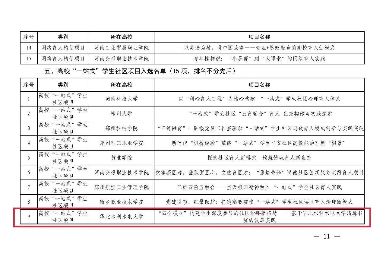 日前获悉,在2025年全省高校思想政治工作质量提升综合改革与精品建设项目评选中,清源书院申报的“’四全模式’构建学生深度参与的社区治理新格局一一基于华北水利水电大学清源书院的改革实践”项目成功入选高校“一站式”学生社区风采展示项目。这项省级荣誉的获得,是上级部门对清源书院育人模式的高度肯定,也是我校深化综合改革、落实立德树人根本任务的标志性成果。