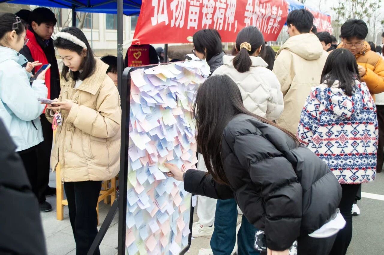 同学们拿起便利贴,认真写下自己未来践行雷锋精神的心愿与承诺:“主动帮助同学,践行互助精神”“参与校园志愿服务,守护美好校园”“将奉献融入日常,做新时代雷锋传人”…… 一张张写满心意的便利贴,被同学们郑重地贴在展板上,这不仅是一份份真诚的约定,更是青年学子传承雷锋精神的坚定决心,小小的展板汇聚起校园里的温暖正能量。