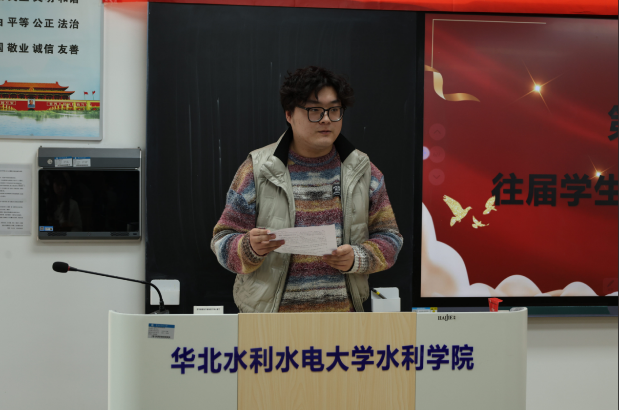 校团委社团工作部部长周游、2023级辅导员郭姣姣、水利学院学工办主任刘贝贝先后宣读新一届主要学生干部任职名单。随后,上一届学生干部赵亮、冉圳桦、花文聪依次登台发言。他们结合自身履职经历分享工作心得,并向新一届学生干部送上“大胆工作、团结协作、工学兼顾”的宝贵建议,倡导大家传承弘扬“情系水利、自强不息”的精神,鼓励新一届干部在未来的学习与工作中乘风破浪、勇攀新高。