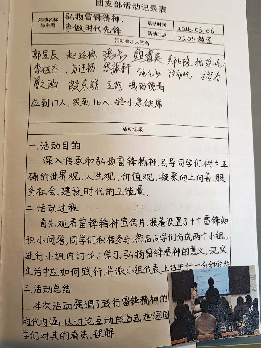 2024017班团支部围绕“弘扬雷锋精神,争做时代先锋”这一核心主题,系统解读雷锋精神的时代意义和实践要求,通过分享榜样事迹、交流学习感悟等形式,引导团员青年感悟无私奉献、助人为乐的优良品格。团支部还组织开展线下学雷锋实践打卡活动,推动理论学习与实践行动深度融合。本次活动帮助同学们进一步明晰新时代青年传承雷锋精神的责任与方向,有效引导大家将学习成果转化为行动自觉,以实际行动服务他人、传递温暖,让雷锋精神在青年一代持续焕发新的生机与活力。