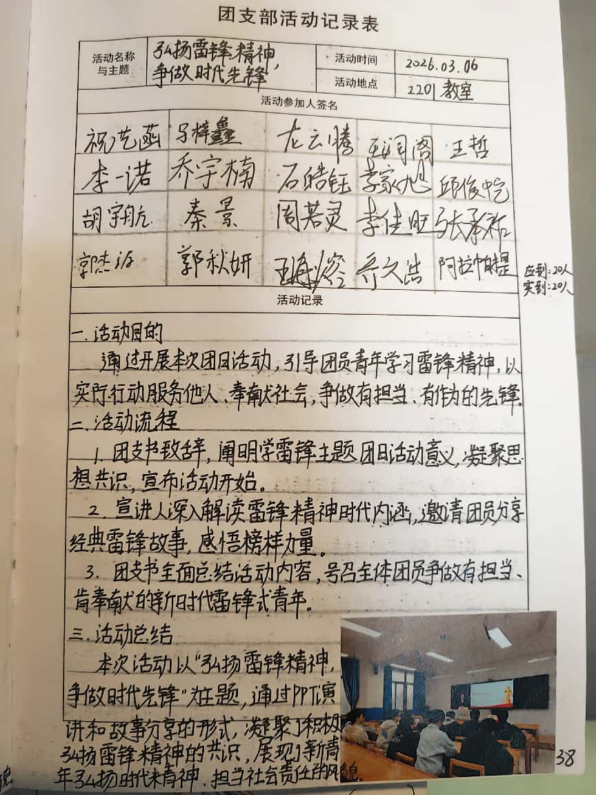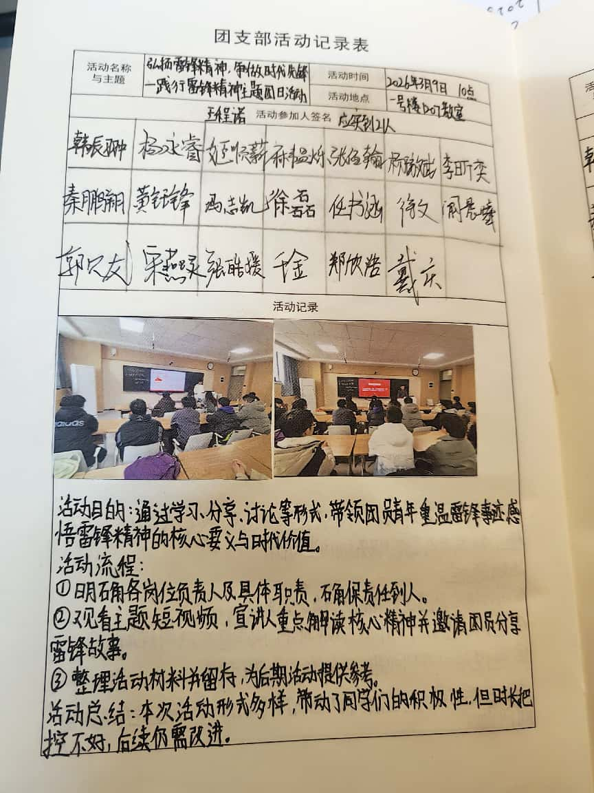 2025019班团支部在“弘扬雷锋精神,争做时代先锋”主题活动记录中,对参与人员、活动开展、过程纪实与总结思考等内容都进行了完整留存,条理清晰、材料齐全,真实展现了活动开展的全过程;手册书写规范、排版整洁,充分体现出团支部扎实的组织工作能力与团员们积极投入的良好风貌。