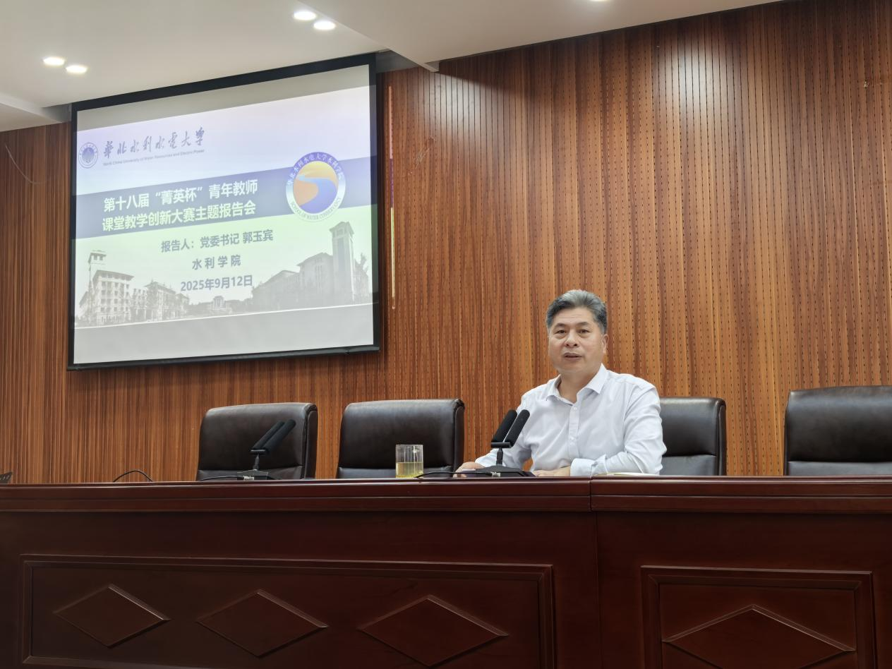 为打造高水平教师队伍,引领青年教师提升教学能力,我院于2025年9月12日在水利楼6025多功能厅举办第十八届“菁英杯”青年教师课堂教学创新大赛师德师风建设活动首场报告会。院党委书记郭玉宾做题为“以教育家精神引领高水平教师队伍建设”的主题报告,水利学院青年教师参加本次活动,报告会由水利学院副院长赵继伟主持。