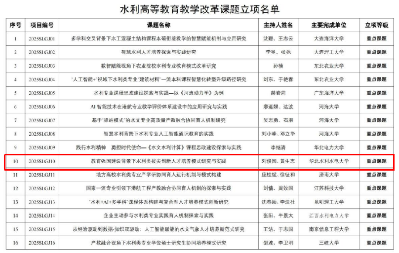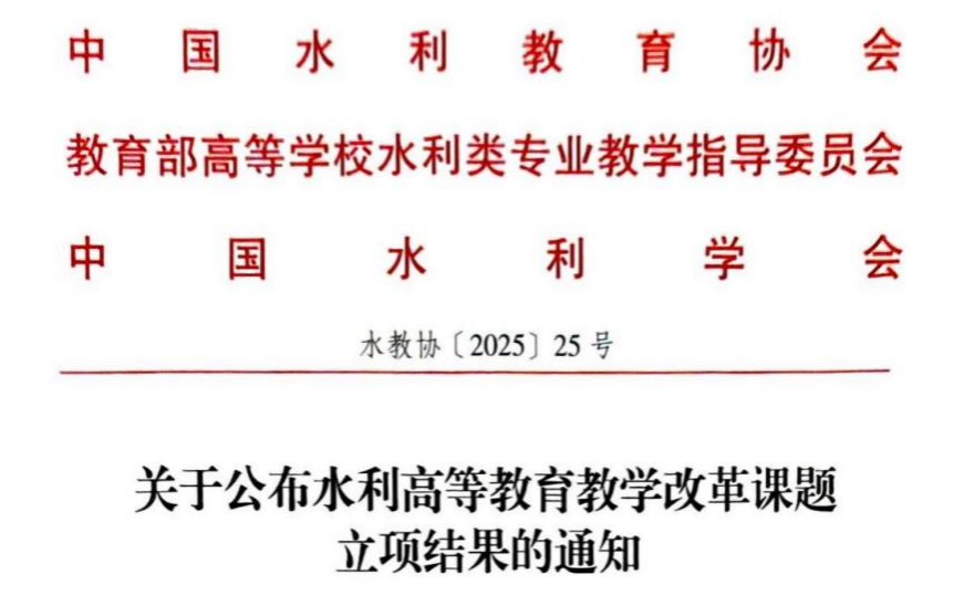 近日,教育部高等学校水利类专业教学指导委员会公布了2025年度水利高等教育教学改革课题立项结果。经个人申报、学校推荐、专家网络评审与会议评审,共立项课题92项,其中重点课题34项、一般课题58项。学院在此次申报中高度重视、组织得力,由刘俊国、黄生志老师主持申报的《教育强国建设背景下水利类拔尖创新人才培养模式研究与实践》成功获批重点课题,标志着学院朝着拔尖创新人才培养模式改革及教育教学研究方向持续深化。