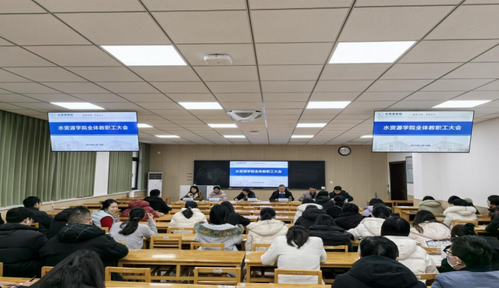1月18日下午,水资源学院召开全体教职工大会暨民主测评会,全面总结2025年度各项工作成效,系统部署2026年重点任务,同步开展民主测评工作。学院领导班子成员及全体教职工参会,会议由学院党委书记冯飞䶮主持。