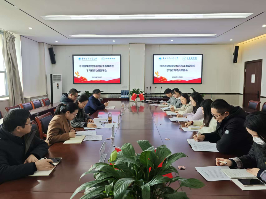 3月6日,水资源学院召开树立和践行正确政绩观学习教育工作部署会,学院领导班子、党委委员及各党支部书记参会,会议由学院党委书记冯飞䶮主持。
