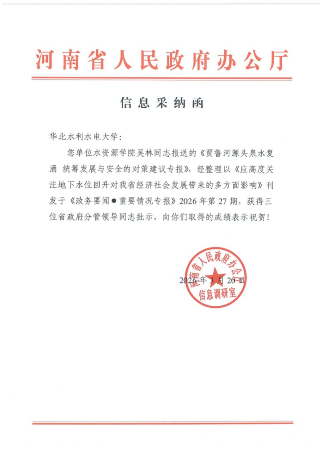 近日,由我院吴林老师报送的《贾鲁河源头泉水复涌 统筹发展与安全的对策建议专报》,经整理以《应高度关注地下水位回升对我省经济社会发展带来的多方面影响》为题刊发于《政务要闻●重要情况专报》2026年第27期,并获三位省政府分管领导同志批示,为地方区域生态保护与安全发展提供了重要决策参考。