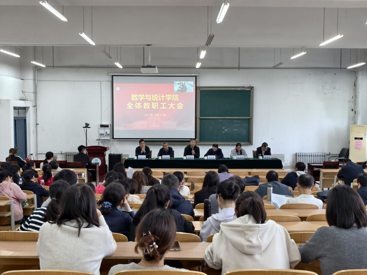 为进一步统一思想、明确发展方向,确保新学期学院各项工作有序高效推进,10月15日下午,学院在S3教学楼二楼东阶梯教室召开全体教职工大会。学院党委书记刘建厅,河南省应用数学中心(华北水利水电大学)主任申建伟,副院长王玉柱,党委副书记任智霞,副院长岳红伟、杨建伟出席会议。会议由刘建厅主持。