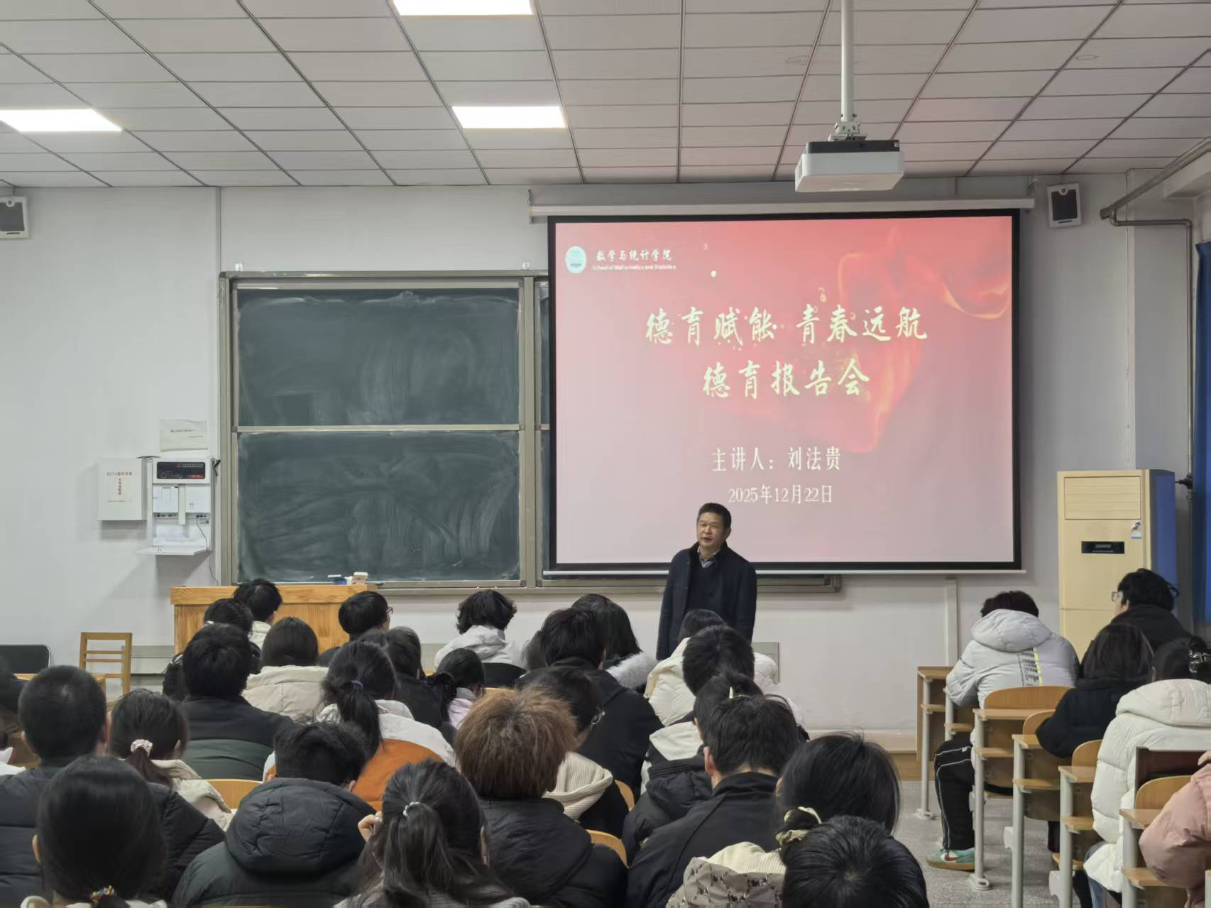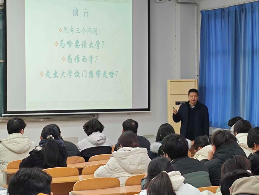 为引导青年学生坚定理想信念、明确成长方向,助力学生在大学阶段实现全面发展,12月22日下午,我院举办“德育赋能,青春远航”德育报告会,学校“五老宣讲团”成员刘法贵教授应邀担任主讲嘉宾。2024级学生代表、2025 级学生100余人参加了报告。报告由学院党委副书记任智霞主持。
