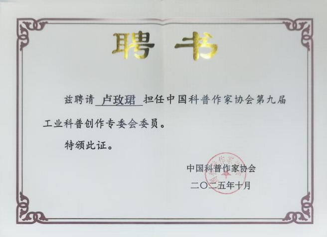 专业参与:卢玫珺教授受任工业科普专业委员会委员