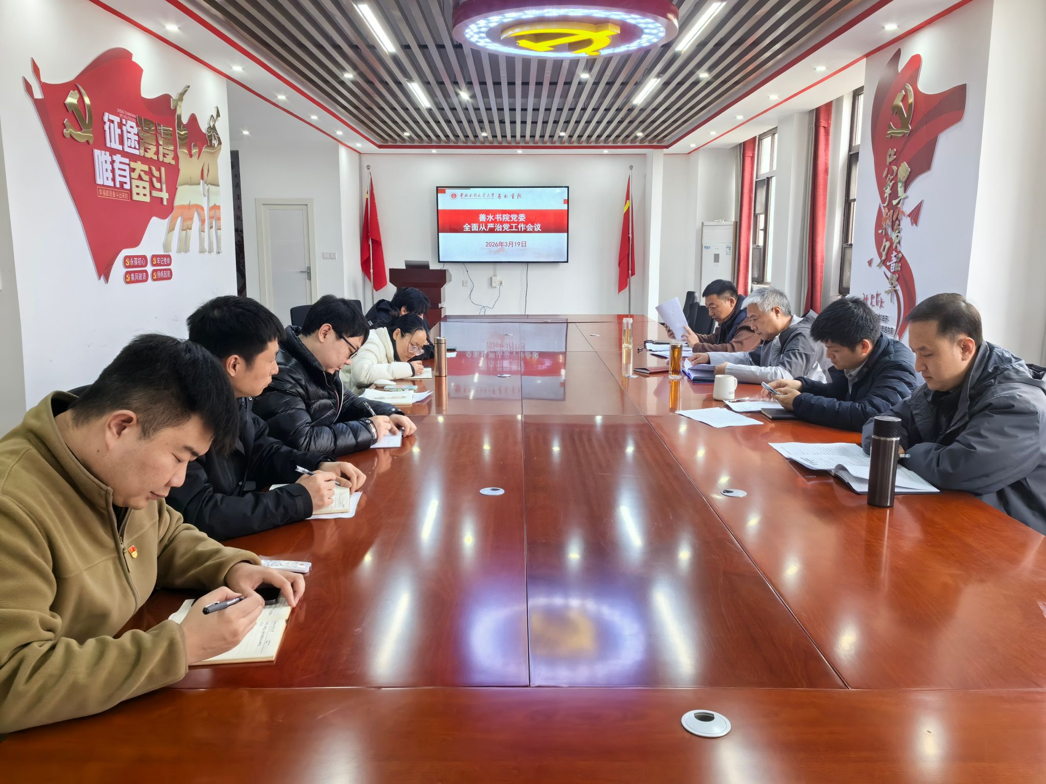 3月19日,善水书院党委(扩大)会议在4227党建活动室召开,书院全体教职工参会,会议由党委书记曹连海主持,专题传达学习学校2026年全面从严治党工作会议暨二届校纪委五次全体(扩大)会议精神,部署书院全年重点工作任务。