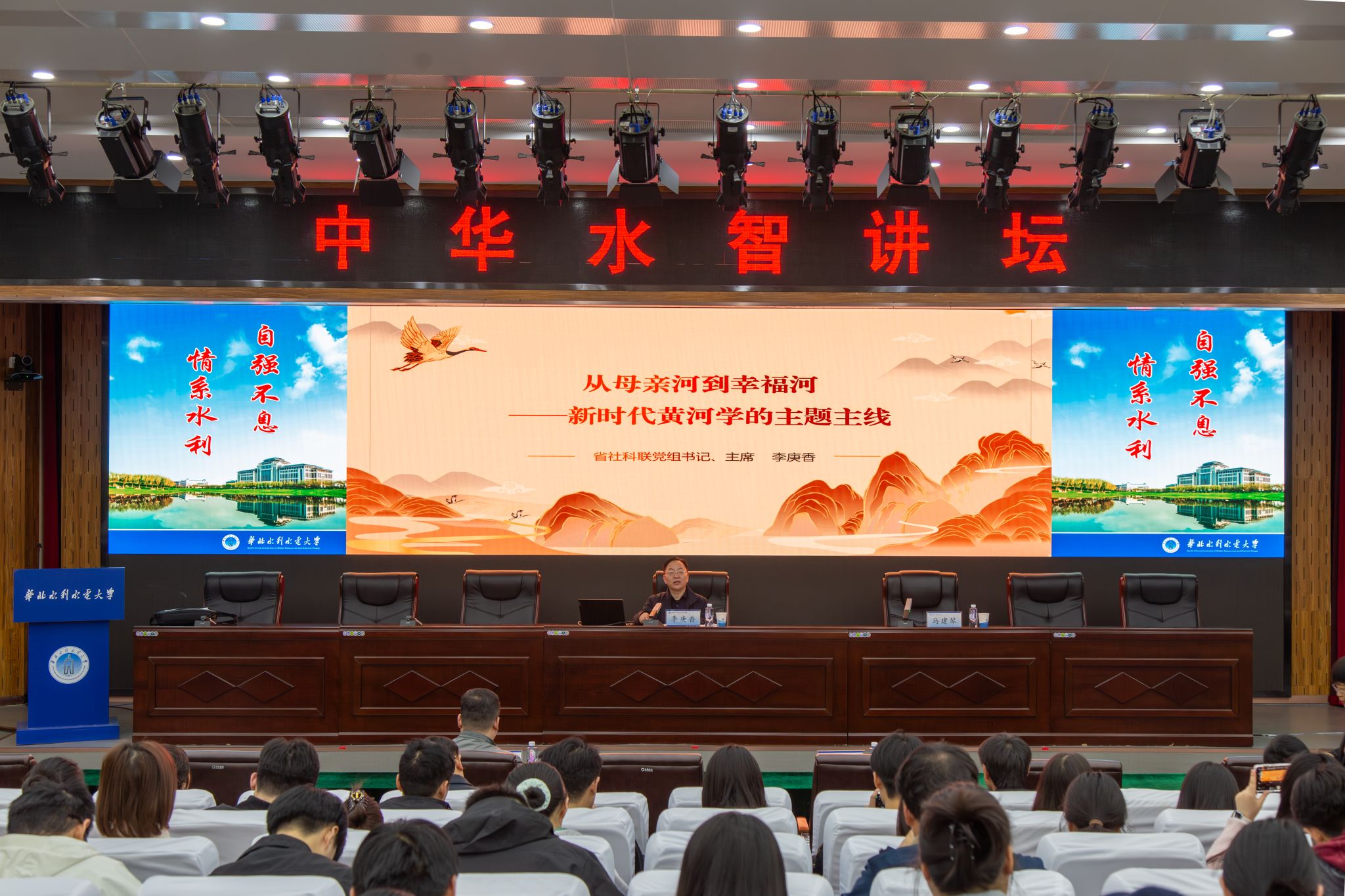 11月13日,河南省社会科学界联合会党组书记、主席李庚香应邀出席我校“中华水智讲坛”,以“从母亲河到幸福河——新时代黄河学的主题主线”为题,为师生作专题讲座。校党委书记王笃波会见了李庚香主席,副校长马建琴主持讲座,水文化研究领域专家学者及师生代表200余人共同聆听了讲座。
