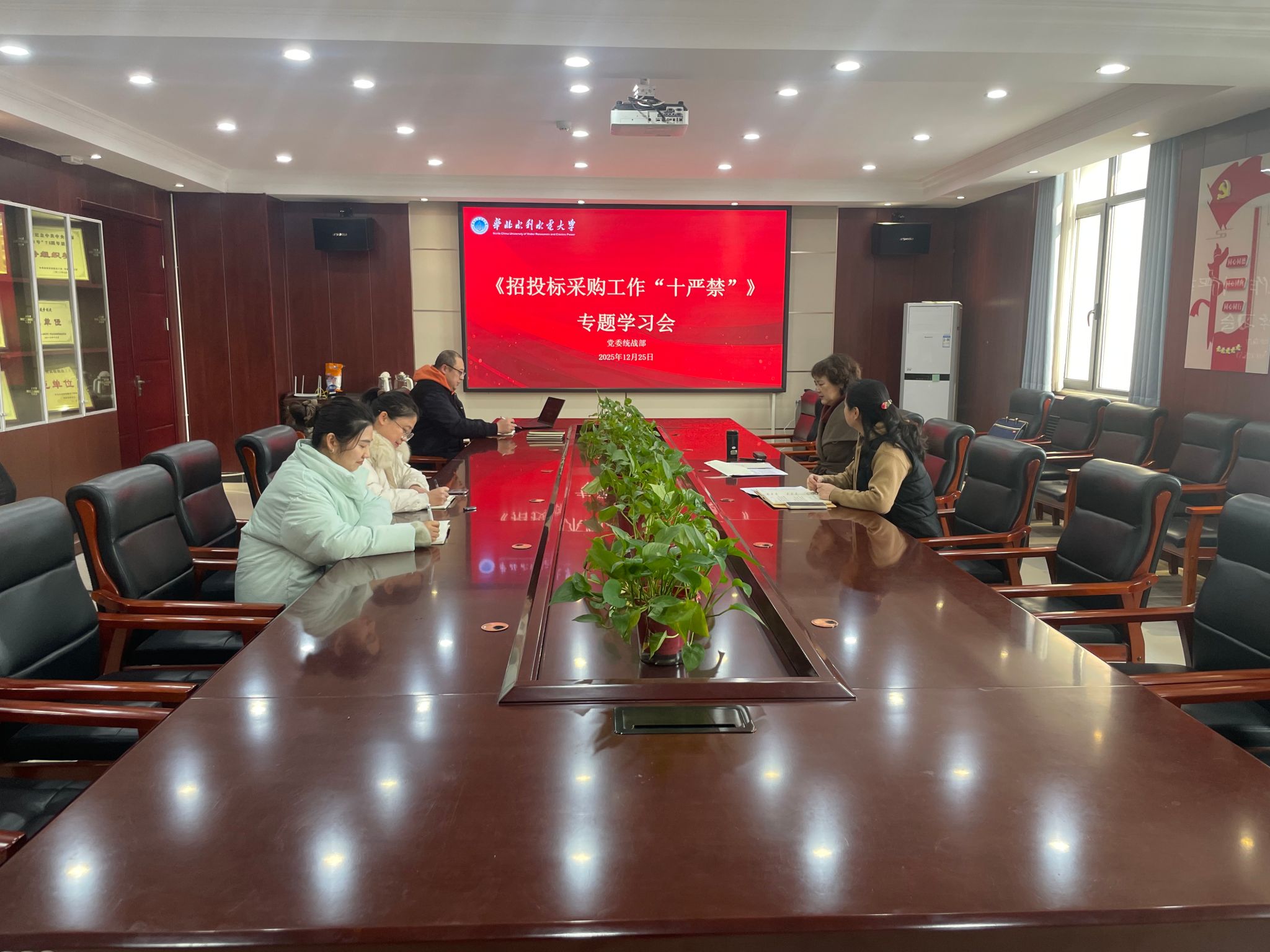 为深入学习贯彻党的二十届四中全会精神,进一步规范政府采购行为,提升教职工廉洁自律意识,加强招标采购过程中的廉政风险防控,12月25日上午,党委统战部召开学习《招投标采购工作“十严禁”》暨招标采购领域法规培训专题会议,会议由党委统战部副部长雷鸣主持。