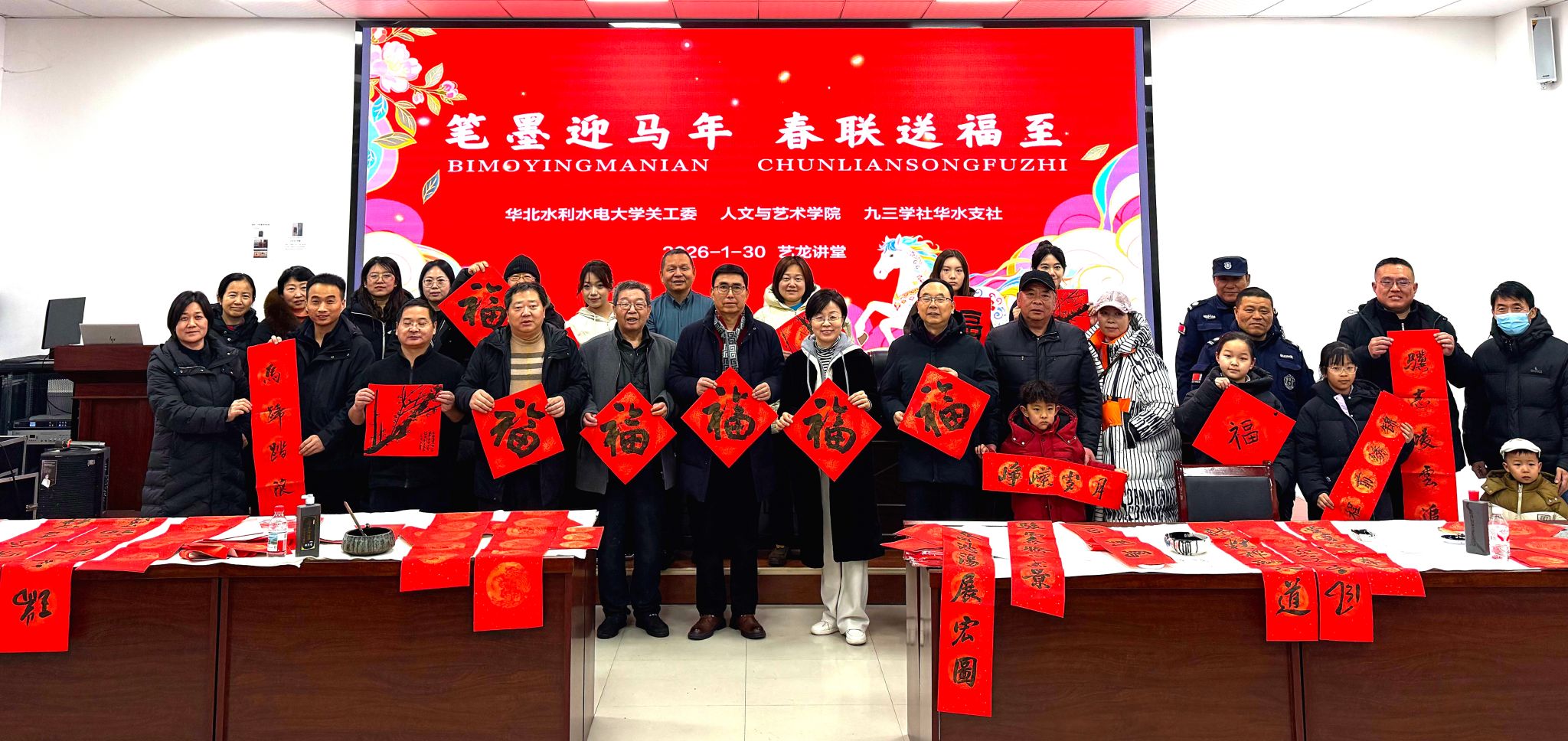 瑞雪迎新春,笔墨传温情。1月30日(农历腊月十二)上午,九三学社华北水利水电大学支社携手校关心下一代工作委员会、人文与艺术学院,在S2艺龙讲堂开展“笔墨迎马年,春联送福至”新春送福活动,为全校教职工送上饱含年味的新春祝福。校关工委主任石品,艺术学院院长武金勇,九三学社华水支社主委芦荻出席活动,艺术学院研究生关关悦、赵铭崎等书法新秀同台挥毫,与现场教职工共迎丙午新春。