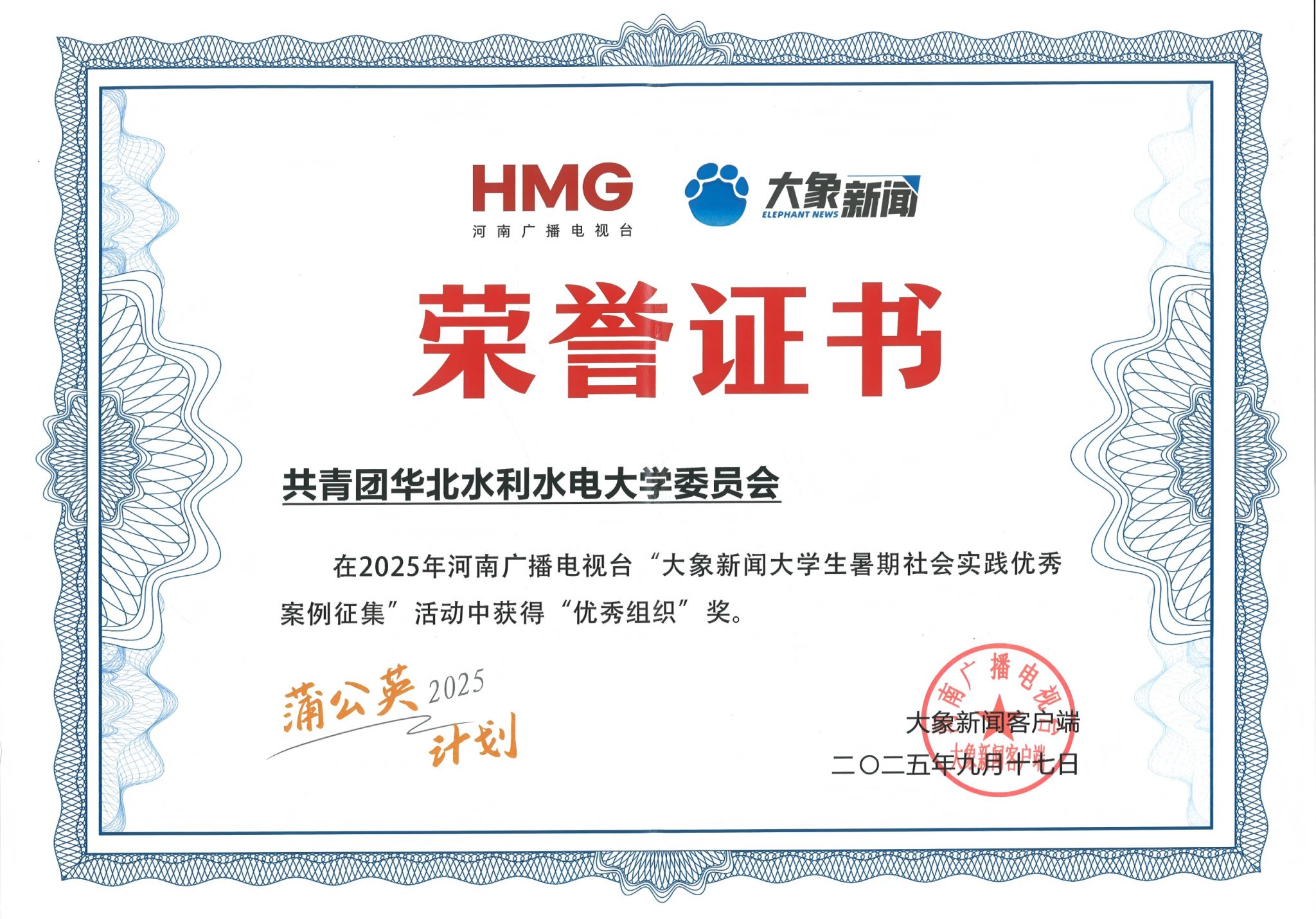 近日,在河南广播电视台大象新闻客户端举办的“大象新闻大学生暑期社会实践优秀案例征集”活动中,华北水利水电大学凭借扎实的实践成效、丰富的成果展示及广泛的社会影响力,荣获“优秀组织奖”。活动期间,学校优秀实践团队风采与成果在大象新闻专栏集中呈现,收获校内外一致好评,品牌传播度与社会影响力持续提升。