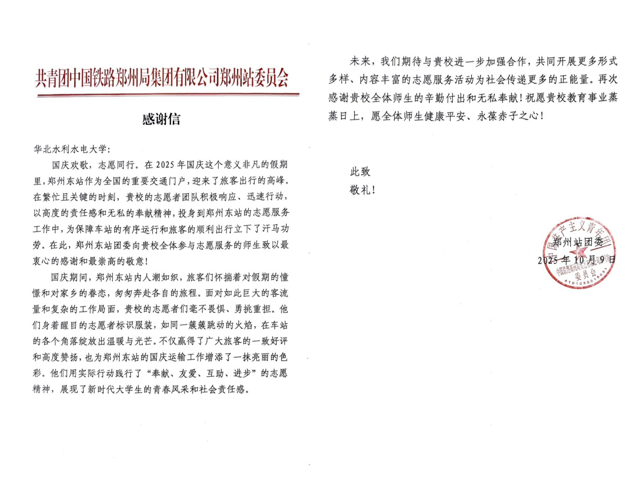 近日,郑州站团委向我校发来感谢信,对我校青年学子国庆假期期间在郑州东站参与的“红韵高铁,志愿领航”专项志愿服务活动表示高度赞扬。信中特别指出,在国庆客流高峰时段,我校志愿者凭借专业化、体系化的服务,日均服务旅客超过3000人次,解决各类实际问题200余件,成为车站内一道亮丽的风景线,有力彰显了新时代青年“奉献、友爱、互助、进步”的志愿精神与责任担当。