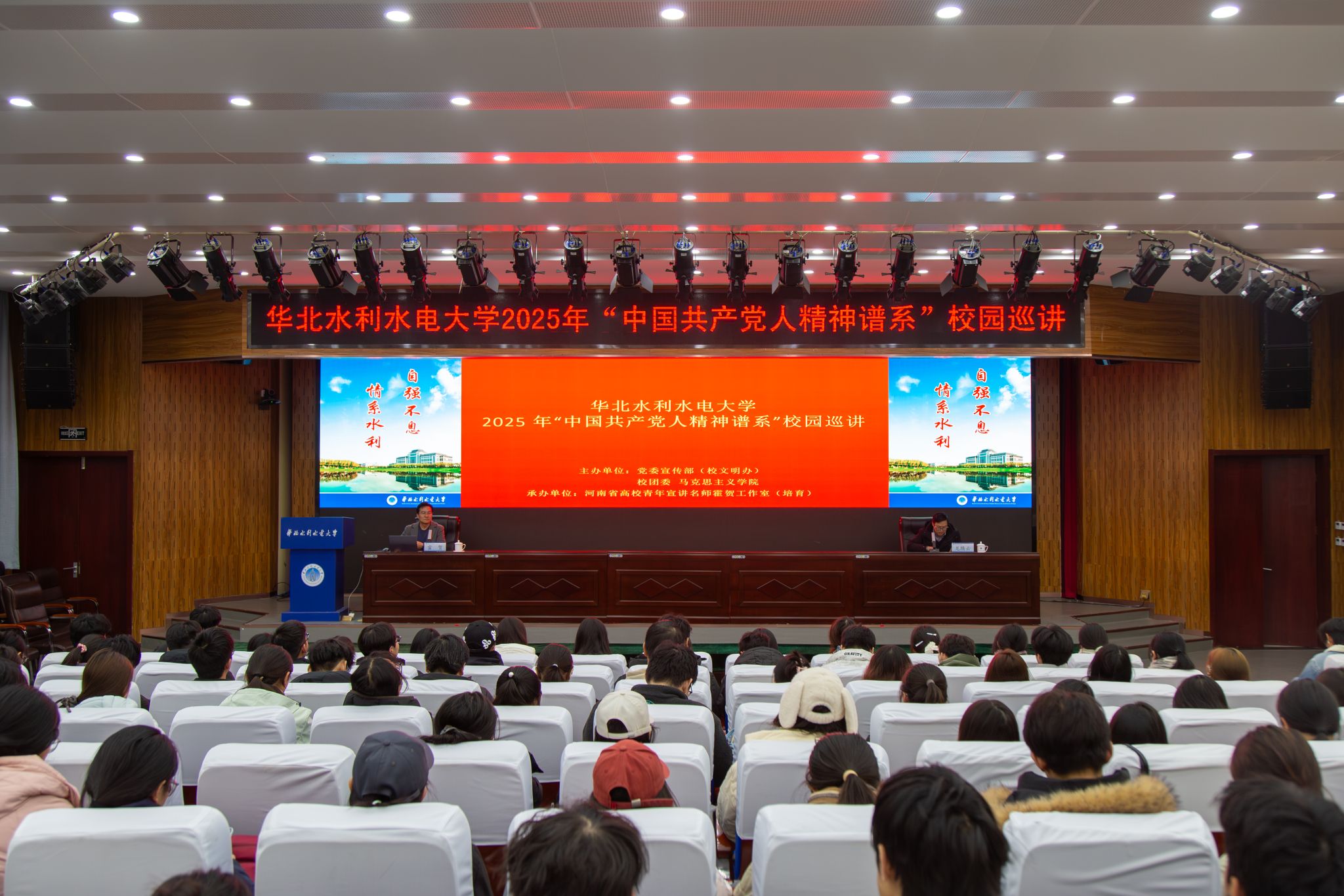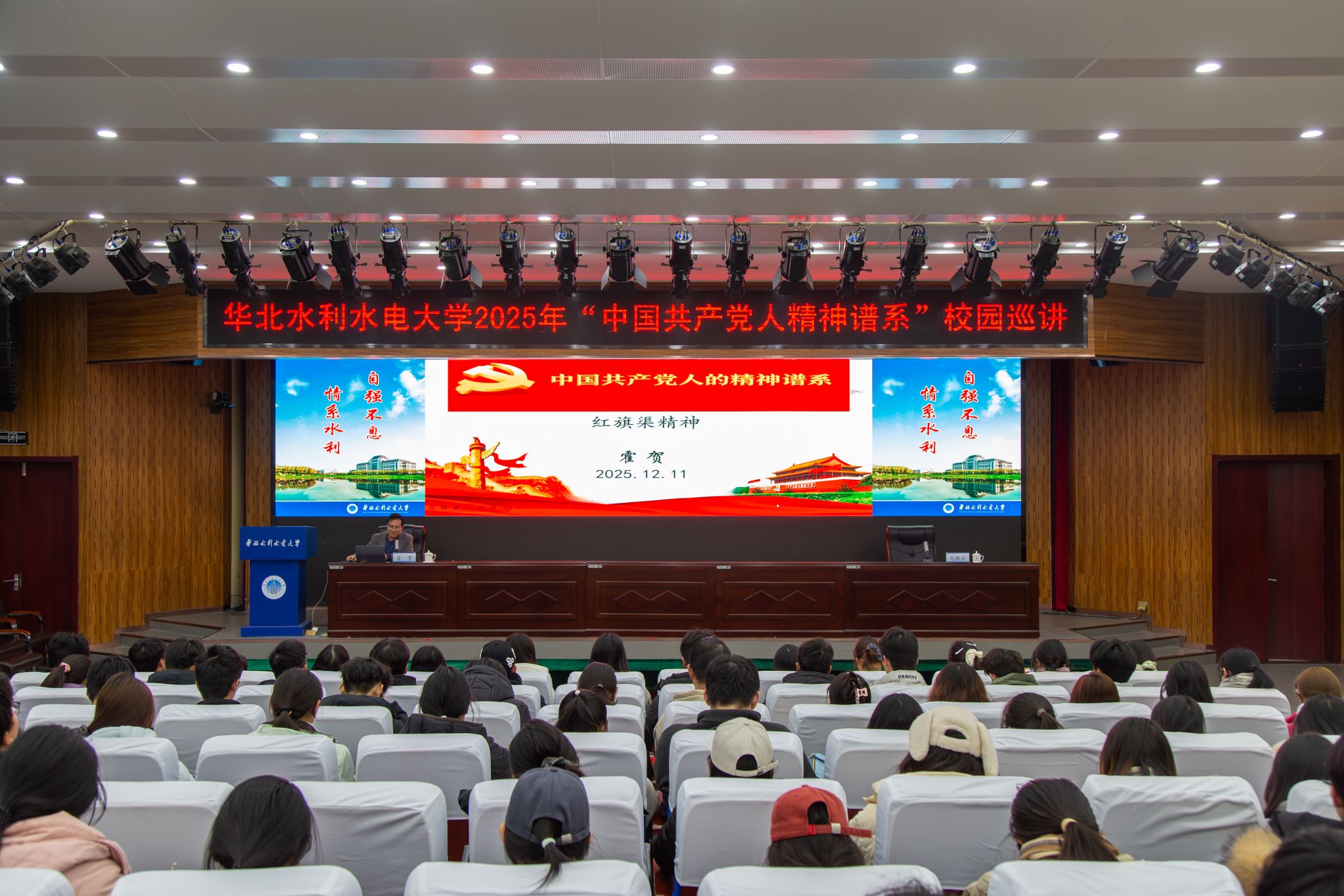 霍贺围绕“中国共产党人精神谱系”中的重要组成部分“红旗渠精神”,从“红旗渠开凿的时代背景”“红旗渠精神的丰富内涵”“红旗渠精神的时代价值”三个方面,进行了深入人心的宣讲。他以中华民族治水史为切入点,以富有感染力的讲述和深厚扎实的学识,将红旗渠那段战天斗地的峥嵘岁月,生动地呈现在师生面前。他讲道,红旗渠精神是中华民族不可磨灭的历史记忆,是对“社会主义是拼出来的、干出来的、拿生命换来的”生动注解。红旗渠并不仅仅是一条物理意义上的石砌水渠,而是一条写满了初心使命、承载着价值追求、凝结着勇气智慧、蕴含着创新创造、流淌着奋斗气质的精神丰碑。实现强国建设和民族复兴的宏伟目标,需要“立下愚公移山志,敢教日月换新天”的信念,需要不认命、不服输、敢于战天斗地的气魄,需要大力弘扬红旗渠精神。他强调,青年学子要牢记习近平总书记嘱托,自觉传承弘扬红旗渠精神,像修建红旗渠的前辈们一样把青春热血镌刻在历史的丰碑上。要发扬历史主动精神,团结成“一块坚硬的钢铁”,集聚起团结奋斗、万众一心的磅礴力量,不断夺取新的更大胜利,创造出无愧于时代、无愧于人民、无愧于历史的新业绩。