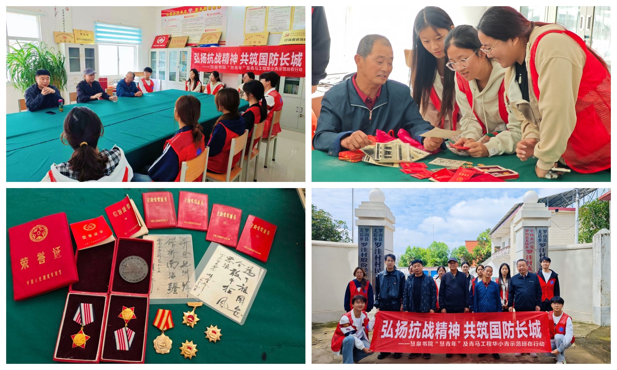 为深入贯彻落实习近平总书记关于共青团要在高校学生思想政治工作中发挥主力军作用的重要指示精神,持续发挥共青团组织在高校“三全育人”格局和“大思政”工作体系中的组织育人、实践育人、文化育人、网络育人等优势,进一步巩固拓展团员和青年学习贯彻习近平新时代中国特色社会主义思想主题教育成果,9月24日,慧泉书院“青马工程”“华小青”示范班学员赴罗洼村党群服务中心开展“弘扬抗战精神 共筑国防长城”交流座谈会,与罗山县三位抗战退役老兵深入交流,旨在引导团员青年深化历史认知,在服务奉献中厚植家国情怀、锤炼意志品质,进一步将爱国情、强国志自觉转化为报国行,不断提升社会责任感和实干能力。