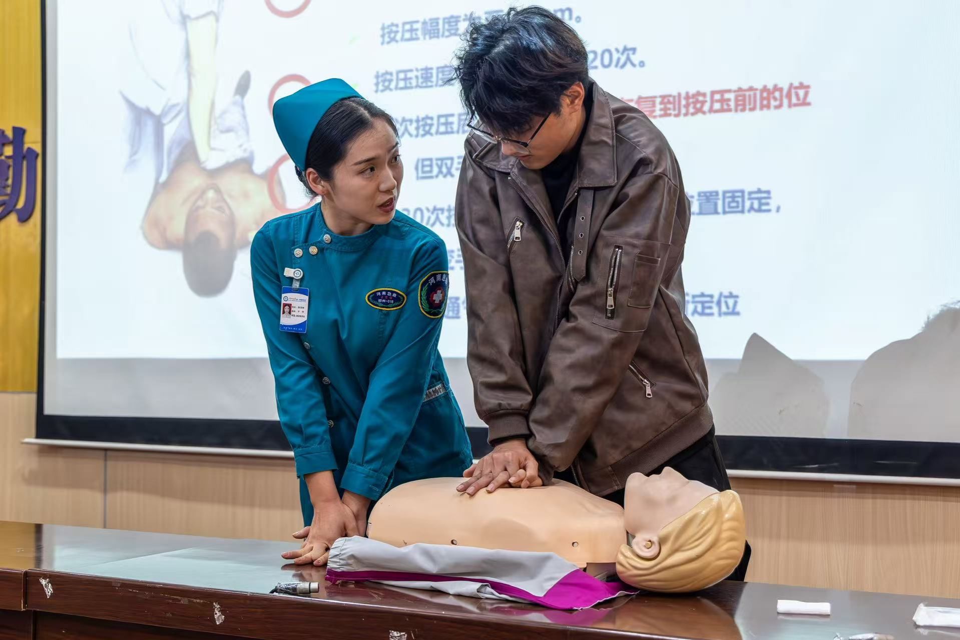 活动中,郑州大学第一附属医院陶晋医师从正确拨打120急救电话,到如何处理心搏骤停、气道异物梗阻、运动损伤等校园常见急症,用通俗的语言配合动画与实际操作,系统地讲解了心肺复苏、AED使用及海姆立克急救法的核心要点。医护志愿者通过真人演示,向师生们展示胸外按压、人工通气、AED贴片与除颤全流程,并邀请同学上台进行实际操作与指导。师生们积极参与互动,与医护人员相互交流,体验救护过程,不断增进理论知识和提高实践能力。
