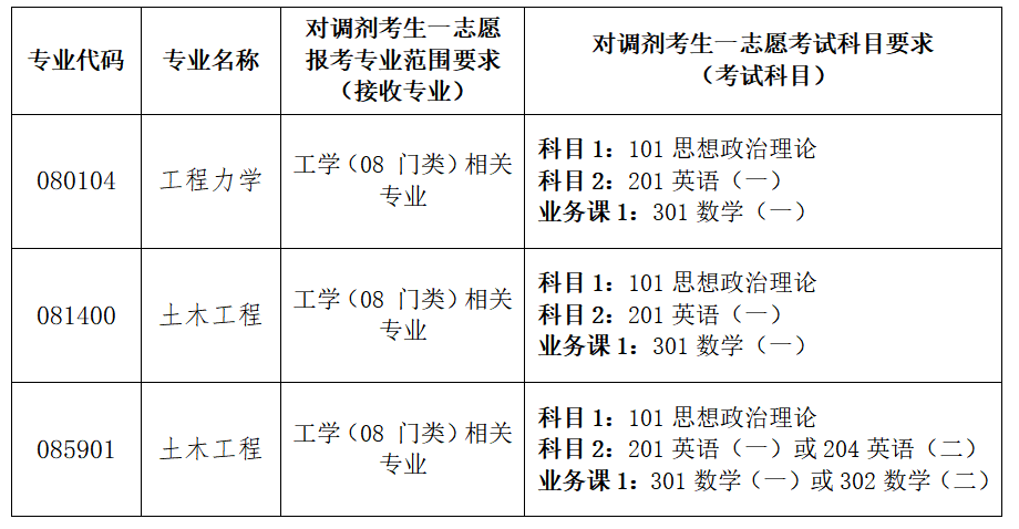 注:第一志愿专业范围以“全国硕士研究生招生调剂服务系统”(以下简称“全国调剂服务系统”)为准。各专业初试科目要求以全国调剂服务系统为准。