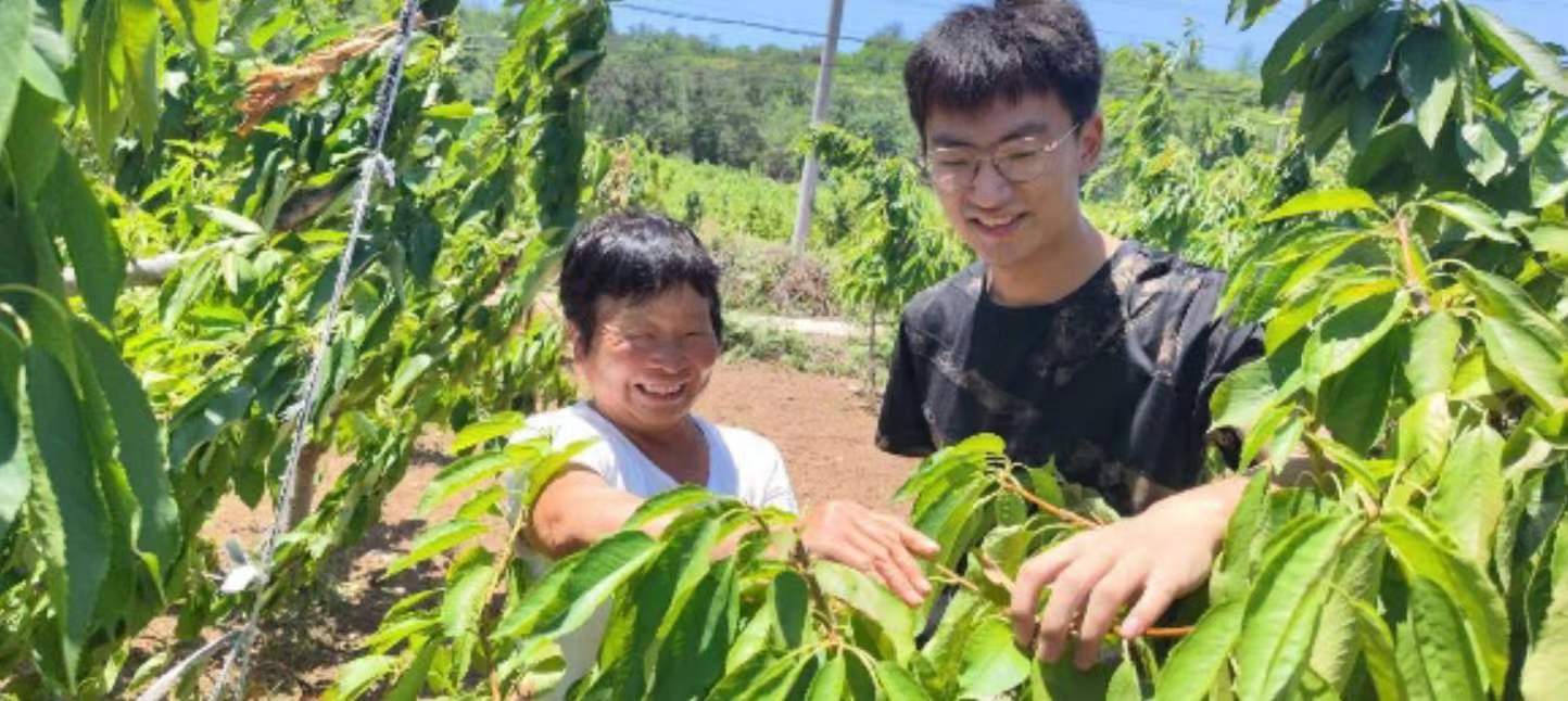 图为志愿者了解尤彰村樱桃种植新产业,种植户阿姨一边向志愿者介绍樱桃的生长,一边脸上洋溢着幸福的笑容。