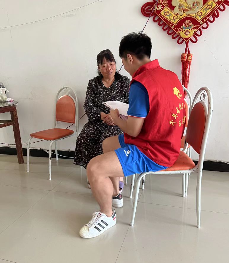 图为志愿者走访尤彰村村民,她表示在党建引导下人们的文化生活得到了充实,自己偶尔也会去跳广场舞。