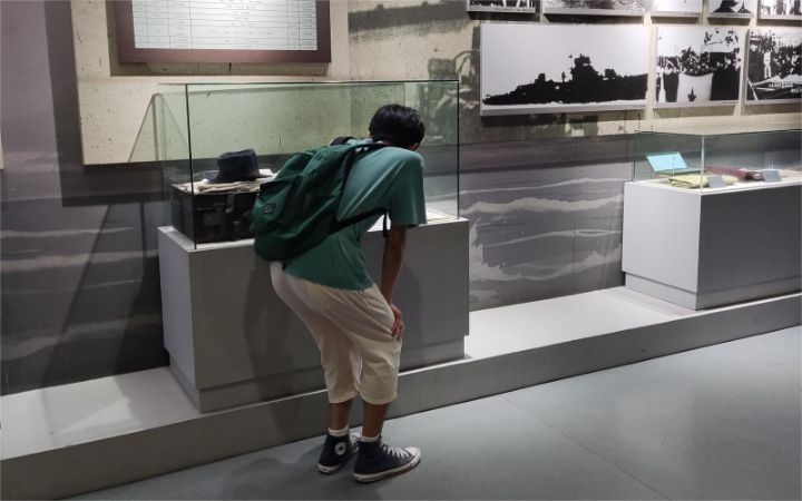 图为桂成同学在中国人民解放军海军诞生地纪念馆内认真参观海军历史文物的照片。